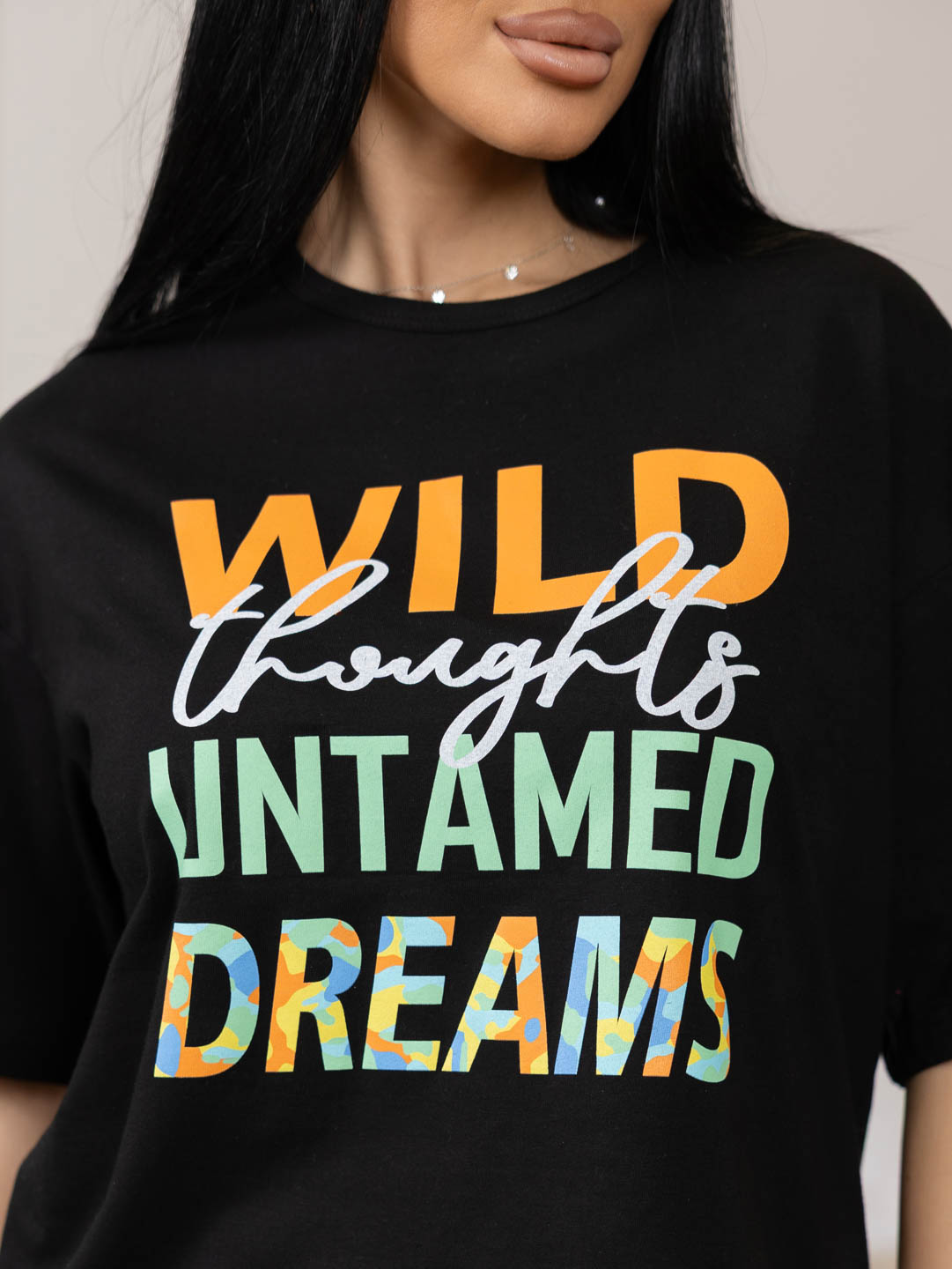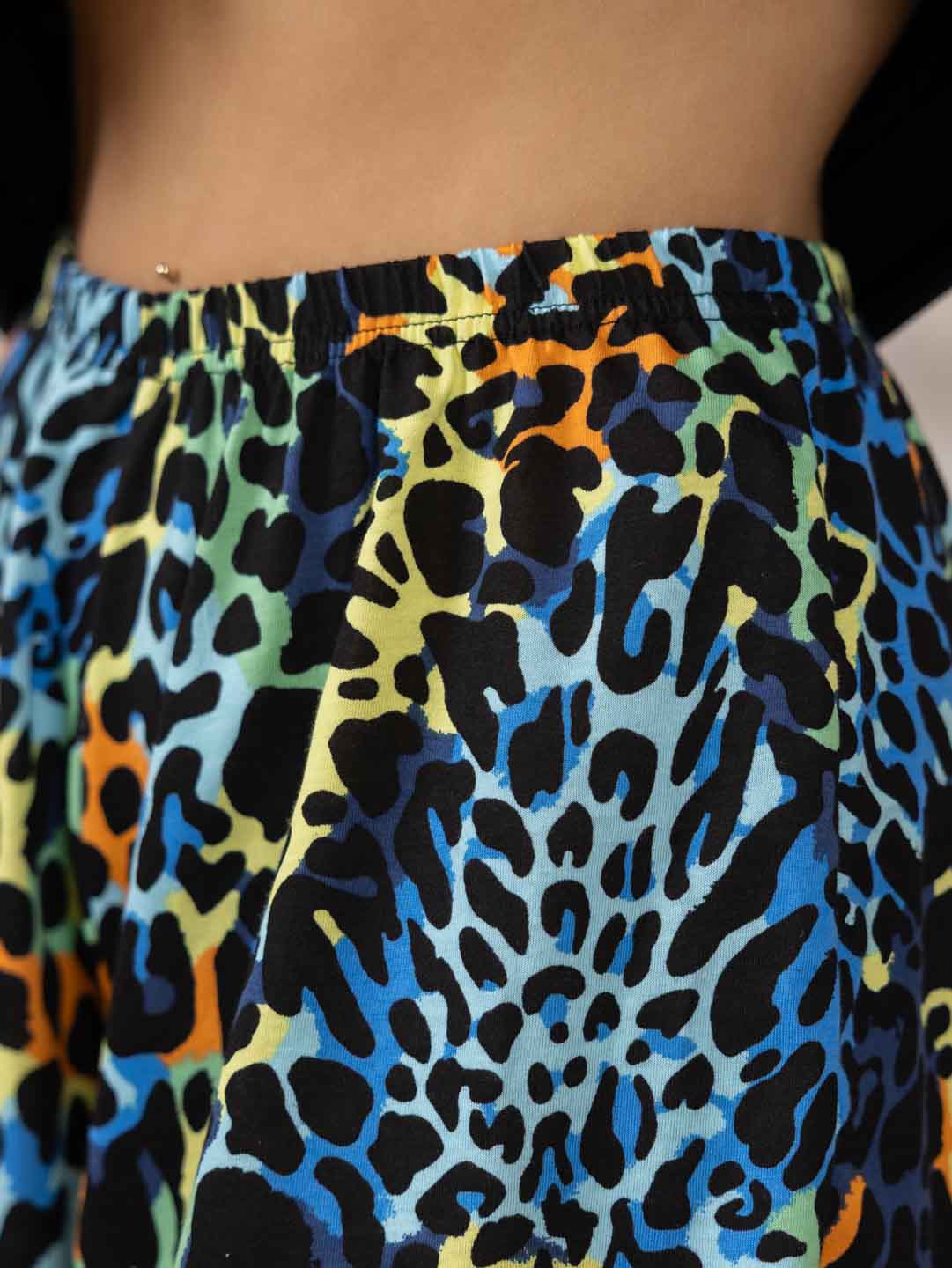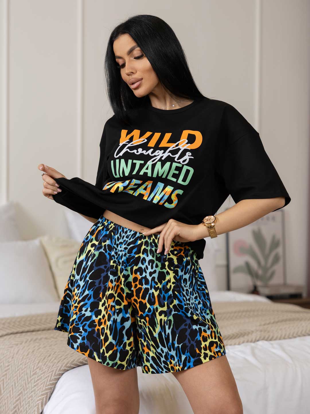 Стильная молодежная пижама с футболкой и юбкой-шортами. Футболка с О-образной горловиной, спущенной линией плеча и печатью спереди. Юбка-шорты имеют трапециевидный крой, выполнены без карманов, на резинке 2см. Костюм сшит из турецкой кулирки, которая отличается мягкостью.