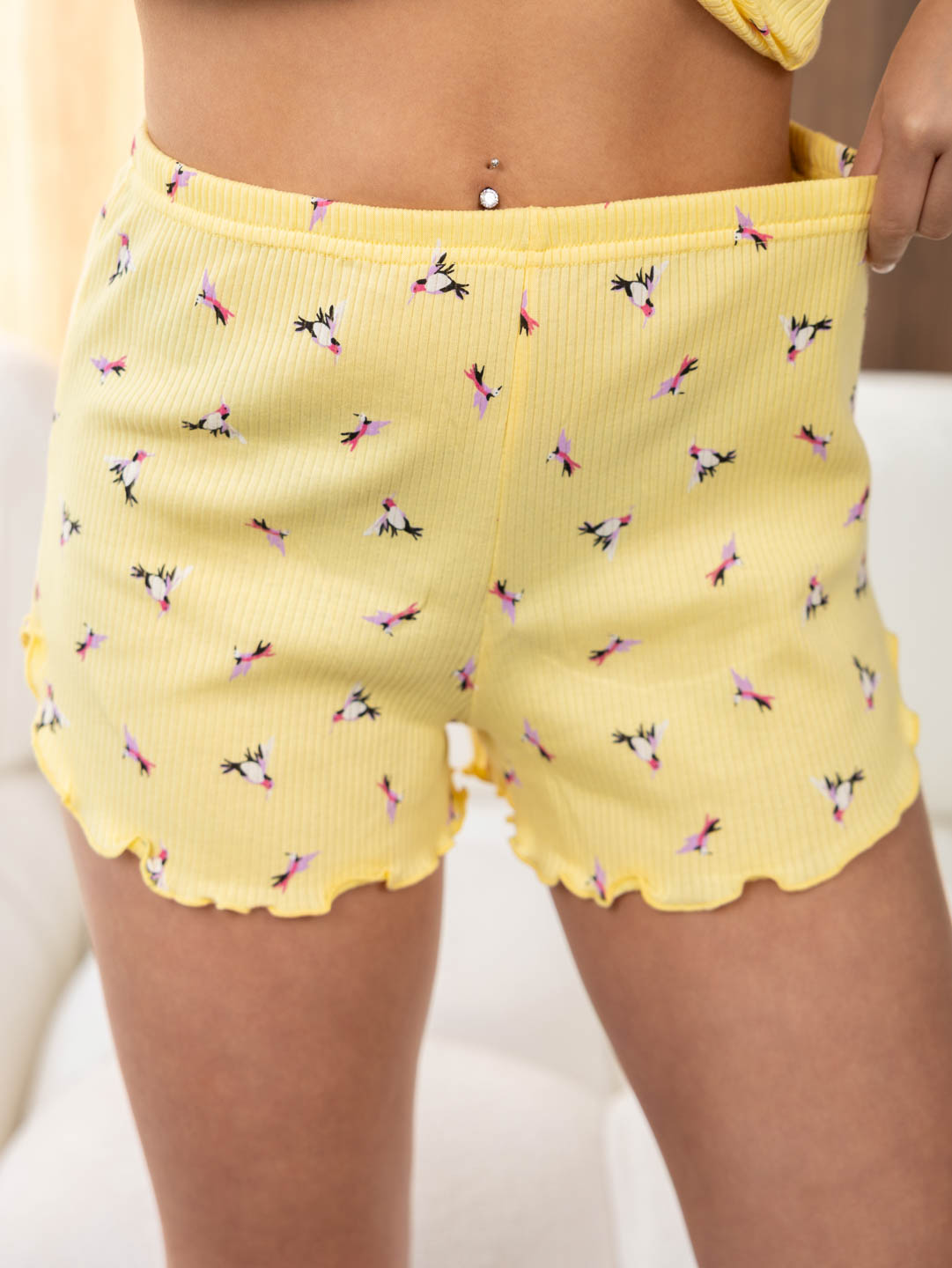 Пижама женская шорты и майка - топ на бретелях. Шорты - короткие, с поясом на резинке, боковым вырезом и обработкой низа в стиле - волан. Легкий, фантастически удобный и приятный к телу комплект, подарит незабываемые ощущения от ночного отдыха.