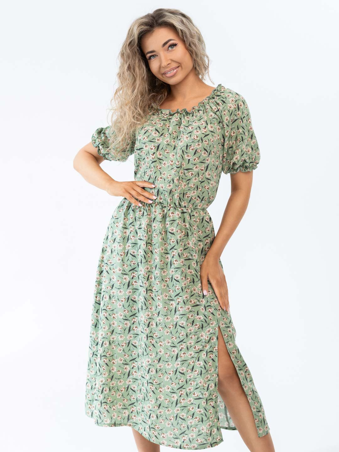 Платье женское с резинкой по горловине и талии, рукав фонарик, юбка с высоким разрезом по ноге, длиной миди. Женское платье из штапеля незаменимо в летнее, весеннее и осеннее время года. Такая модель смотрится прекрасно на любой фигуре, скрывает недостатки и подчеркивая талию. Платье легко комбинируется с любой другой одеждой: косухой, джинсовкой, тренчем.