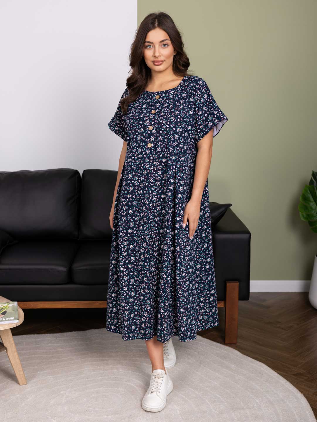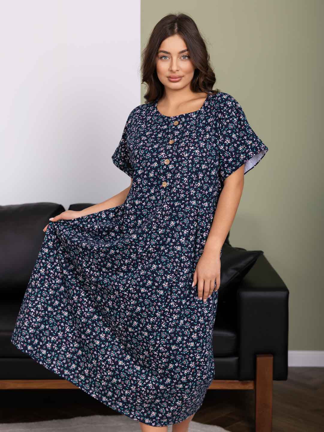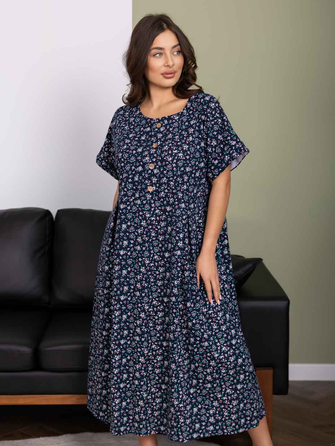 Женское летнее платье из 100% хлопка, с завышенной талией, О-образной горловиной, цельнокроеным рукавом с манжетой, спереди на кокетке пуговыцы, на юбке спереди складки.