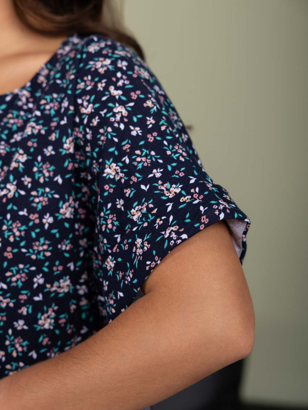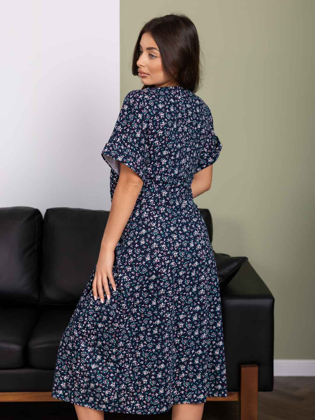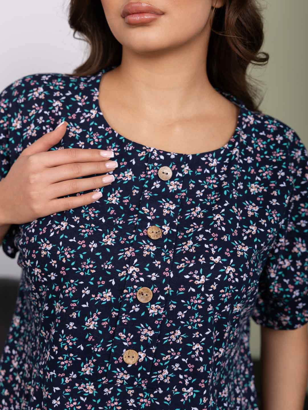 Женское летнее платье из 100% хлопка, с завышенной талией, О-образной горловиной, цельнокроеным рукавом с манжетой, спереди на кокетке пуговыцы, на юбке спереди складки.