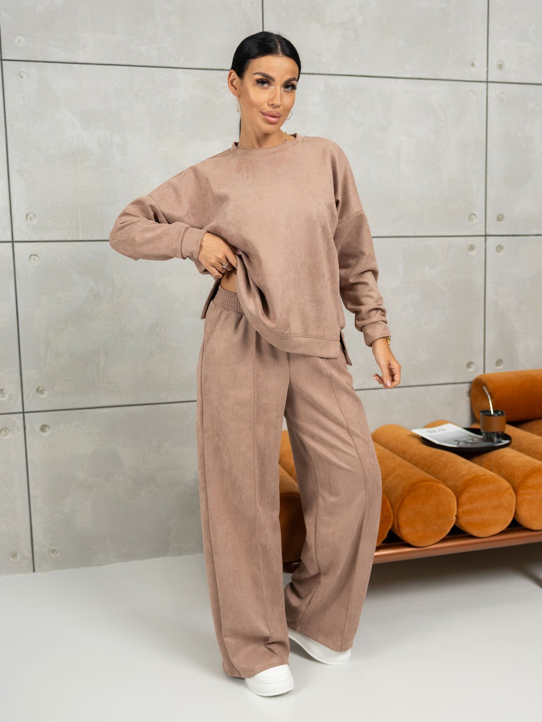 Почувствуйте себя королевой комфорта и стиля с нашим новым брючным костюмом! Двойка выполнена из мягкой и приятной на ощупь замши – прекрасный выбор на весну и осень. Оверсайз крой свитшота скрывает недостатки фигуры, разрезы по бокам и удлиненная спинка придают изюминку образу. А свободные штаны палаццо со стрелками – настоящая находка для современной девушки. Качественная одежда в стиле спорт-шик дарит уверенность себе и отличное настроение!