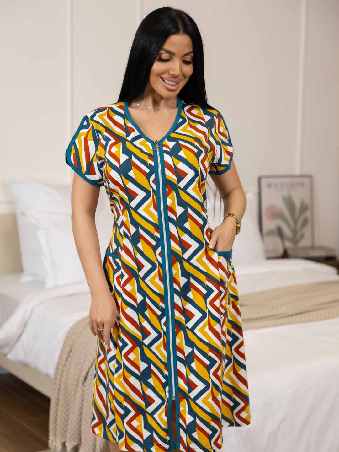 Женский домашний халат из хлопка, полуприлегающего силуэта с застежкой на молнию. Спереди на халате рельефные швы и два накладных кармана. Сзади пояс, обеспечивающий прилегание по спинке и создающий силуэт песочные часы. * Изделие с незначительным заводским дефектом.