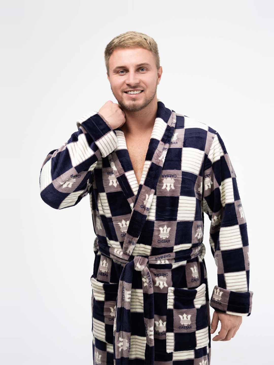 Халат мужской полуприлегающего силуэта из трикотажного полотна «велсофт». Изделие на запах, на поясе. На полочке присутствуют накладные карманы. Вырез горловины V-образный. Рукав втачной длинный. * Изделие с незначительным заводским дефектом.