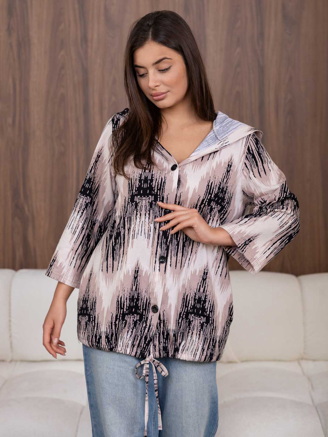 Рубашка с капюшоном из 100% хлопка на пуговицах и кулиске, с рукавом 3/4. Туника выполнена из набивной кулирки турецкого качества. Рост модели 165см.