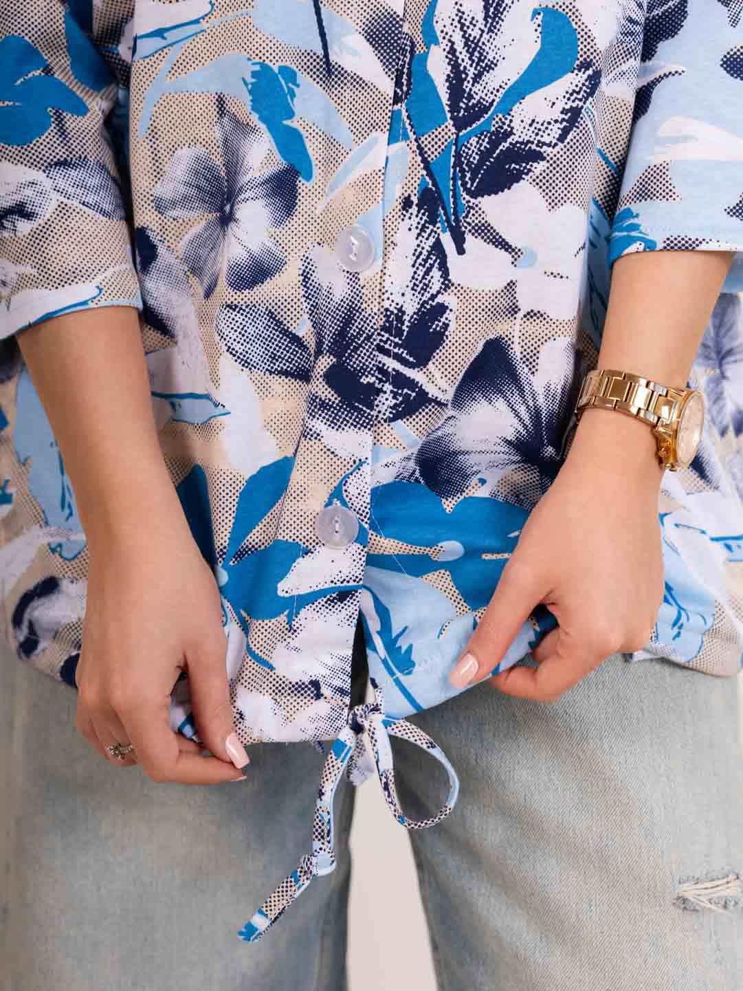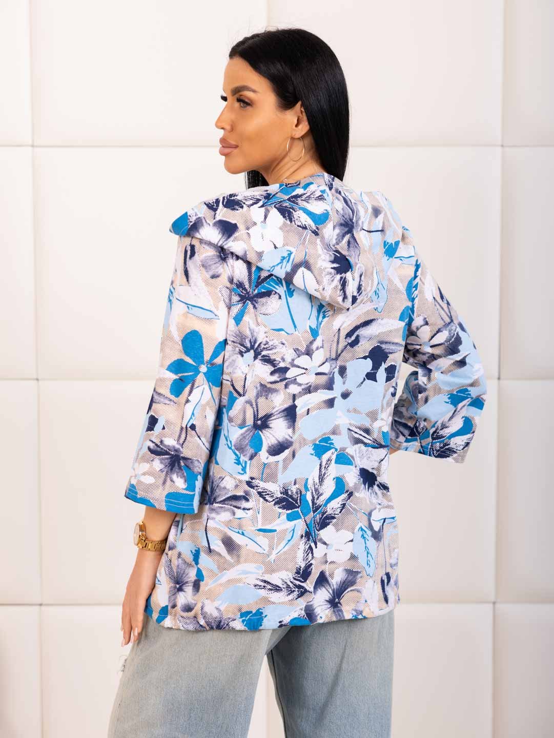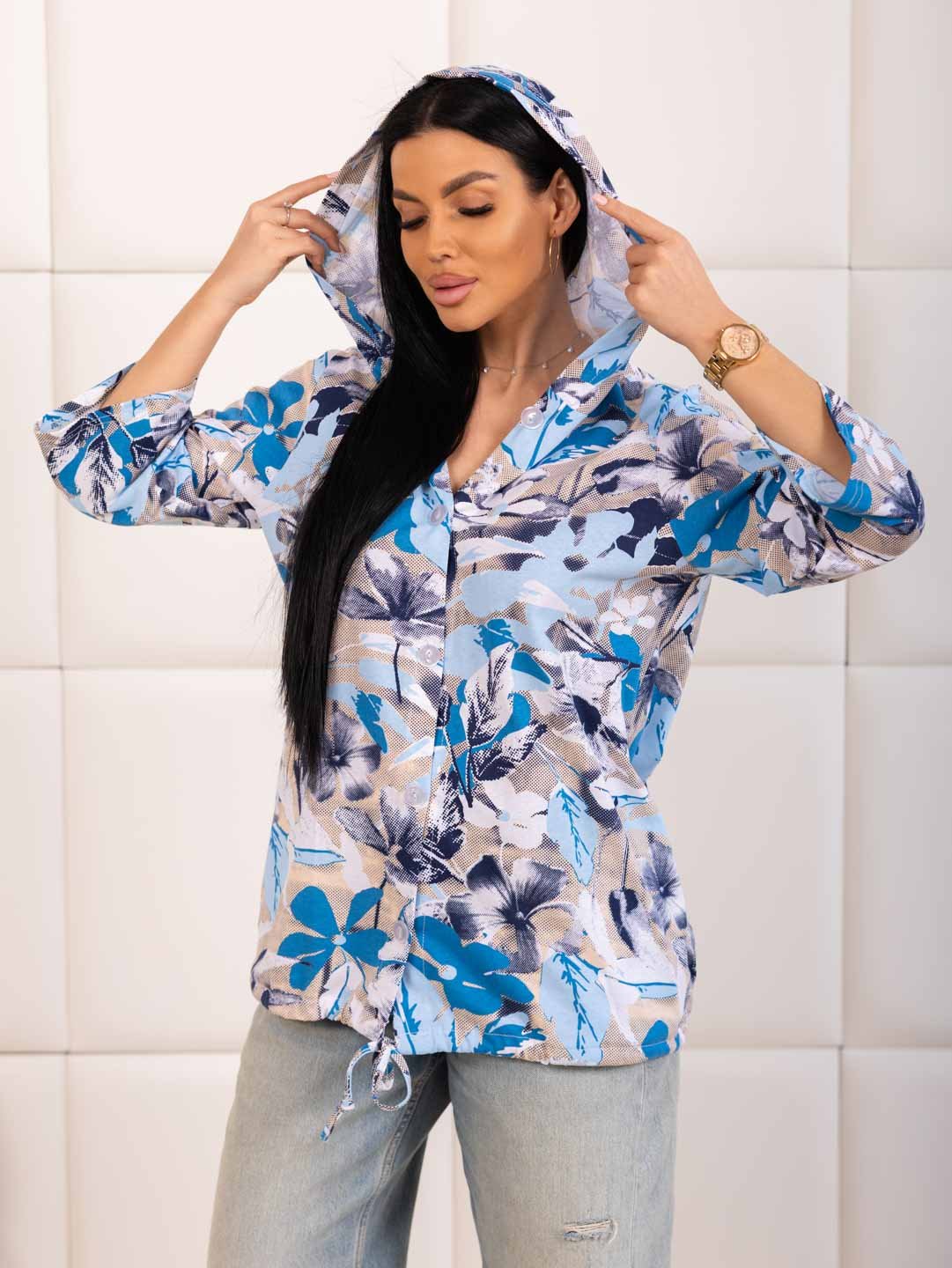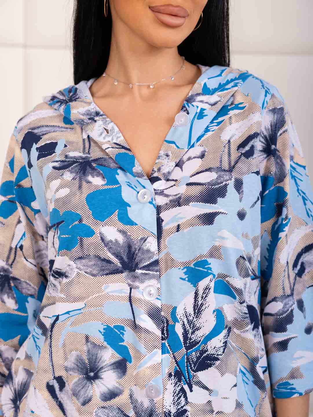 Рубашка с капюшоном из 100% хлопка на пуговицах и кулиске, с рукавом 3/4. Туника выполнена из набивной кулирки турецкого качества. Рост модели 165см.