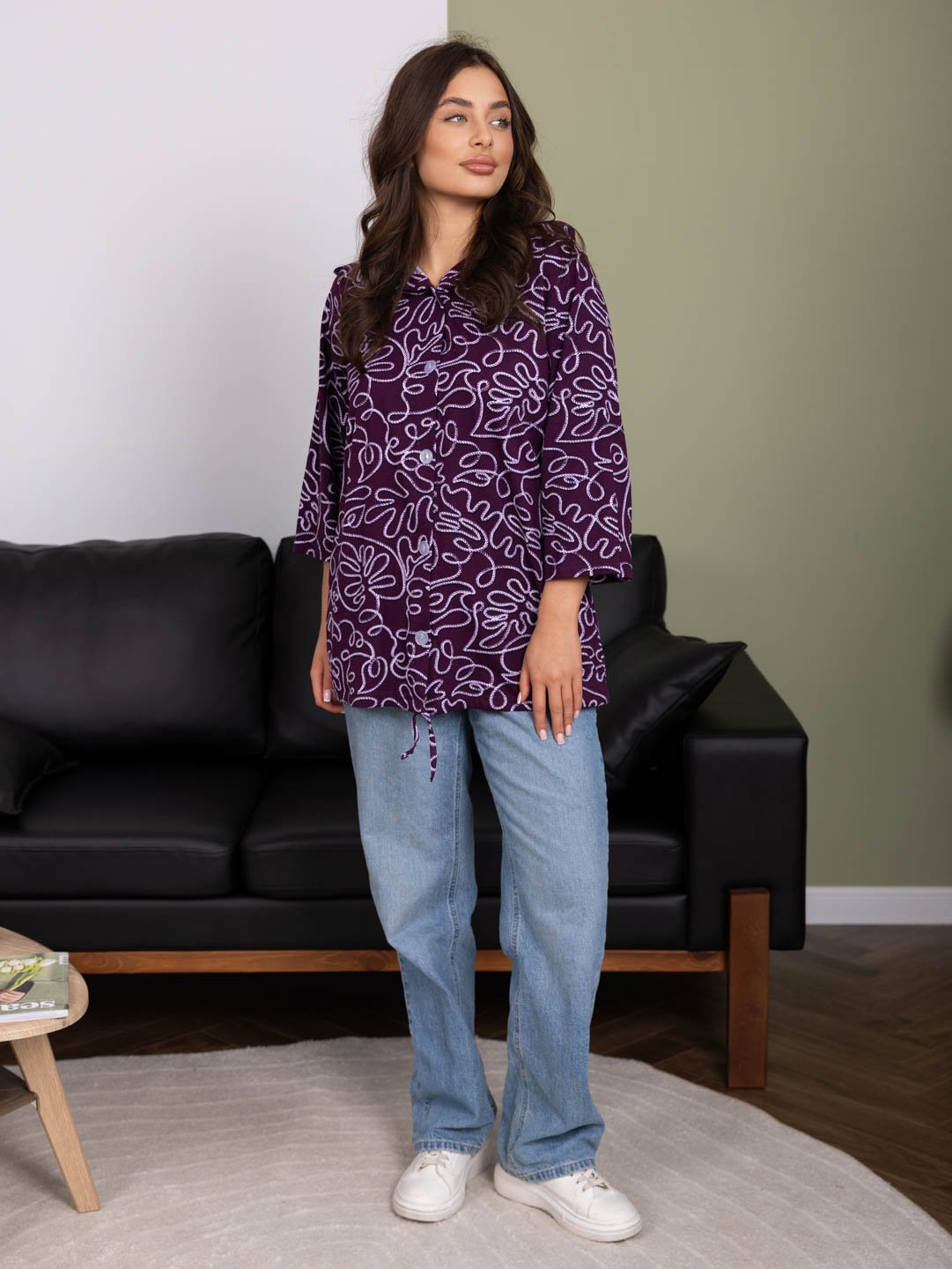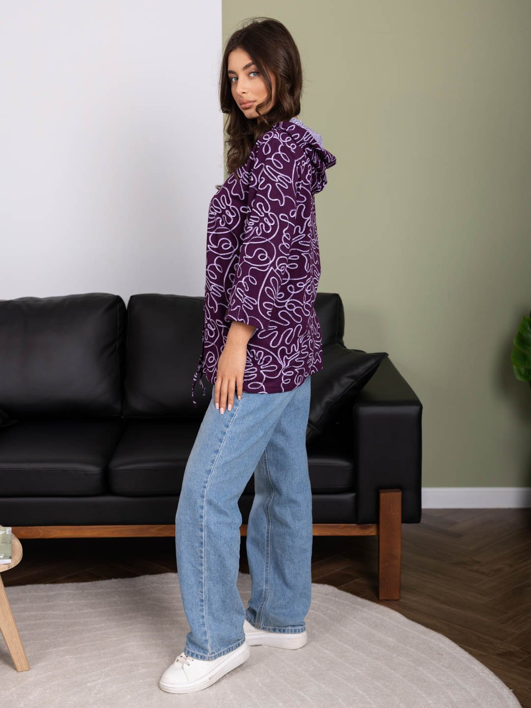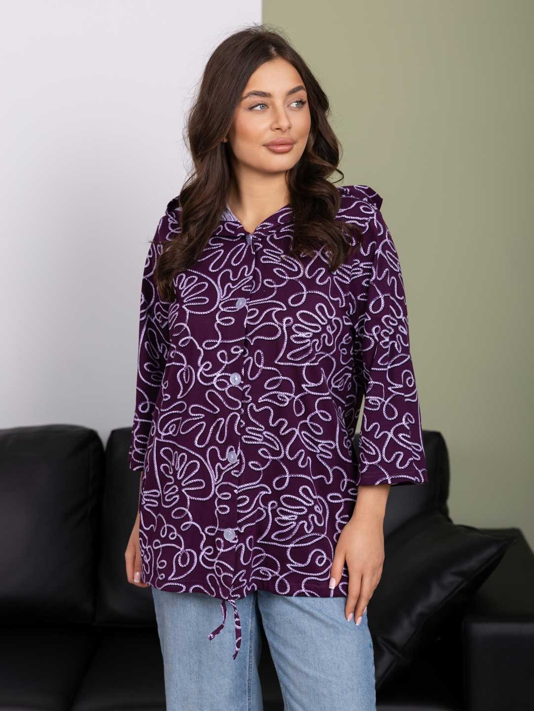 Рубашка с капюшоном из 100% хлопка на пуговицах и кулиске, с рукавом 3/4. Туника выполнена из набивной кулирки турецкого качества. Рост модели 165см.