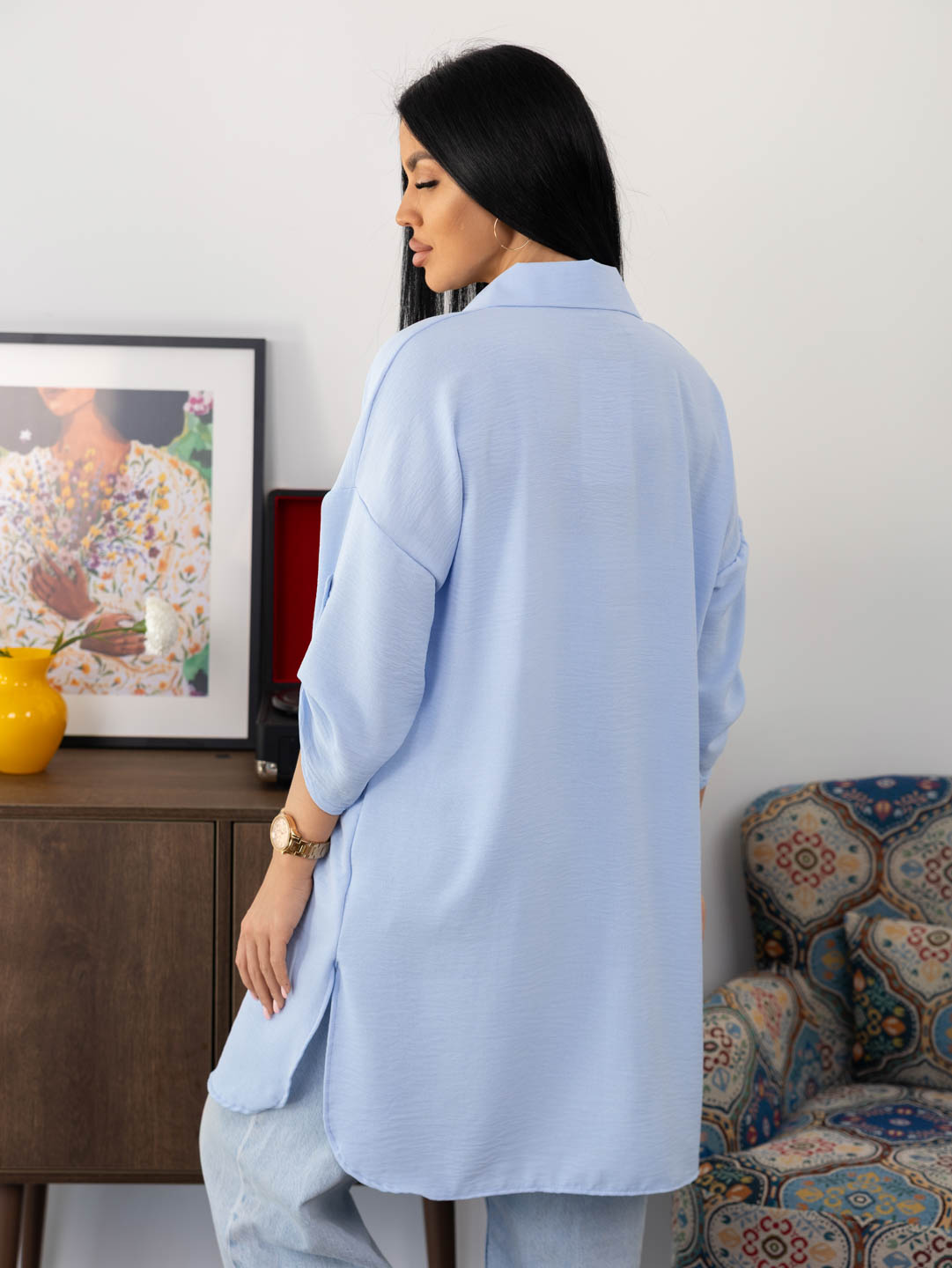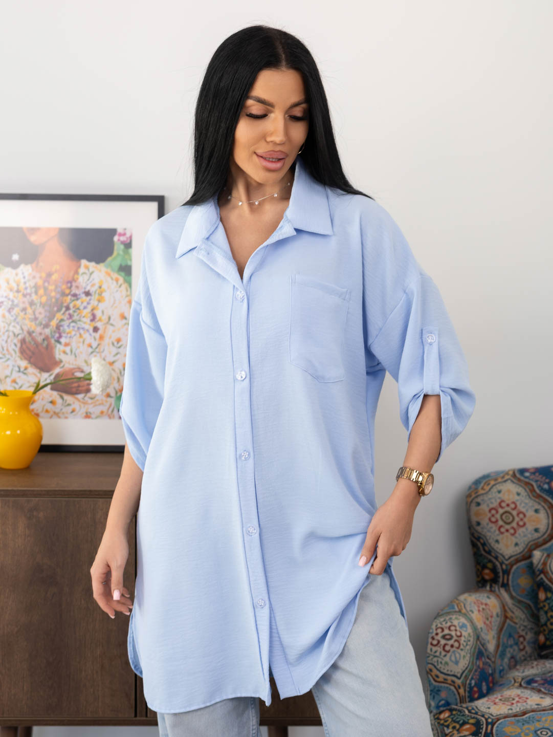 Женская туника из легкого, воздушкного полотна с мятым эффектом. Рубашка с отложным воротником, рукавом 3/4 с патой, разрезами по боковым швам, накладным нагрудным карманом и застежкой на пуговицы. Рост модели 165см.