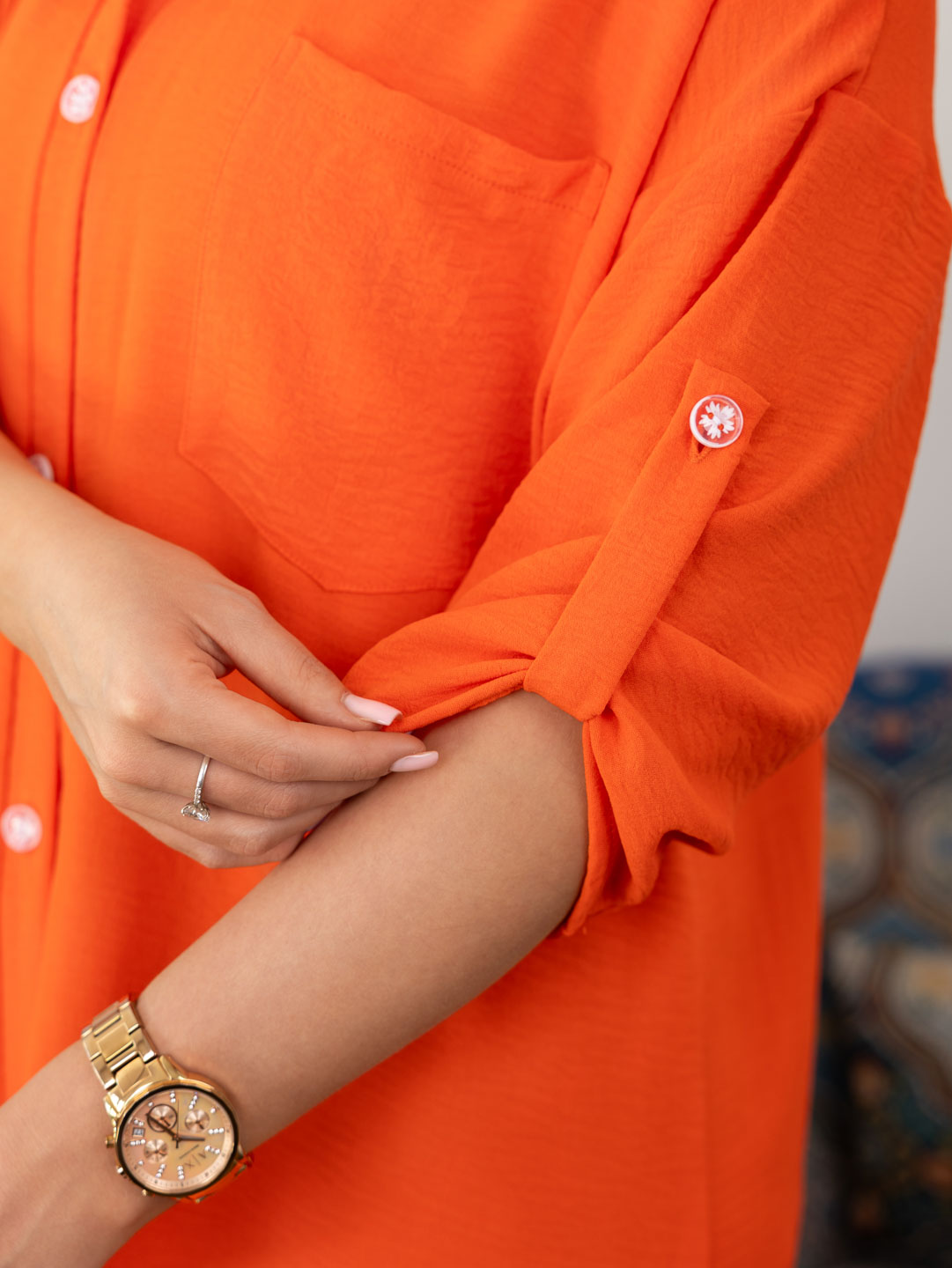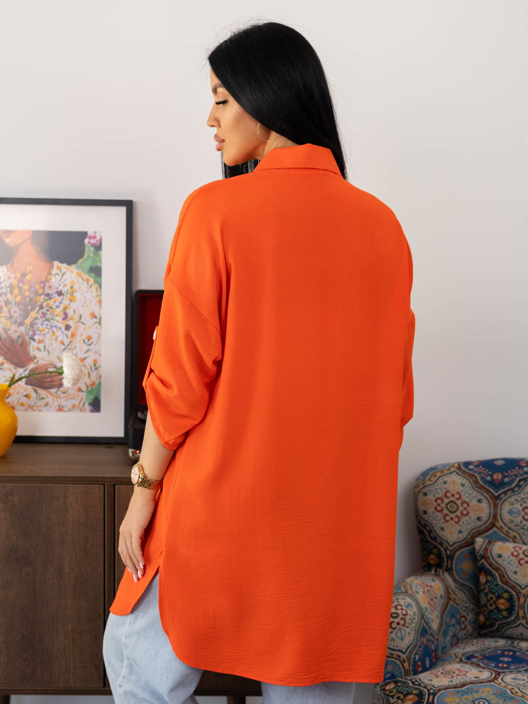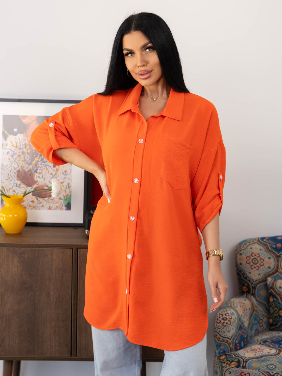 Женская туника из легкого, воздушкного полотна с мятым эффектом. Рубашка с отложным воротником, рукавом 3/4 с патой, разрезами по боковым швам, накладным нагрудным карманом и застежкой на пуговицы. Рост модели 165см.