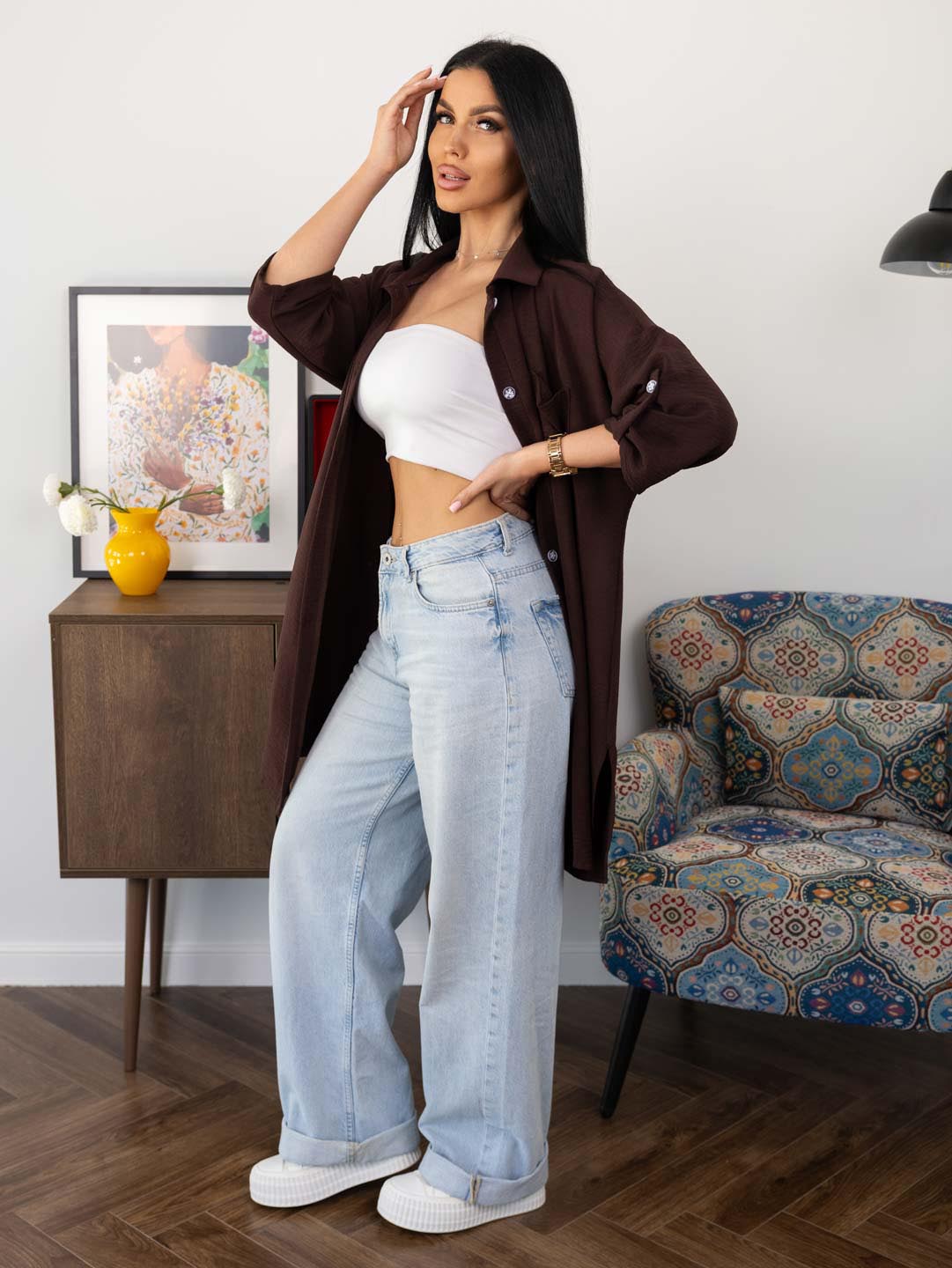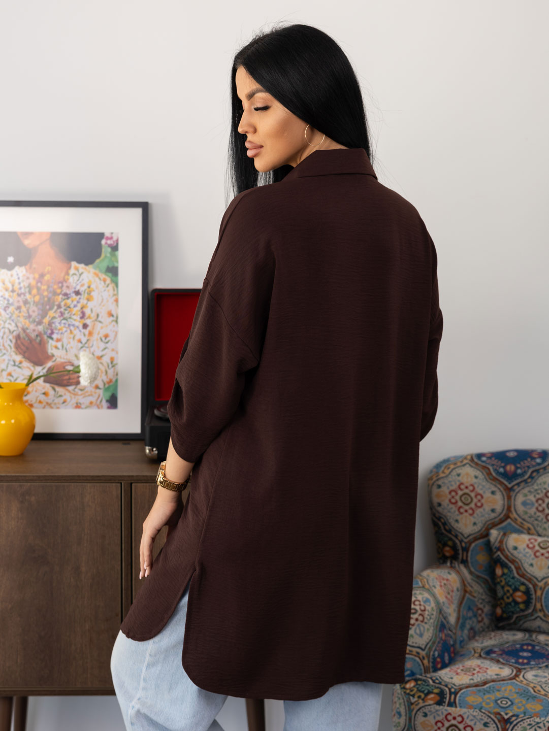 Женская туника из легкого, воздушкного полотна с мятым эффектом. Рубашка с отложным воротником, рукавом 3/4 с патой, разрезами по боковым швам, накладным нагрудным карманом и застежкой на пуговицы. Рост модели 165см.