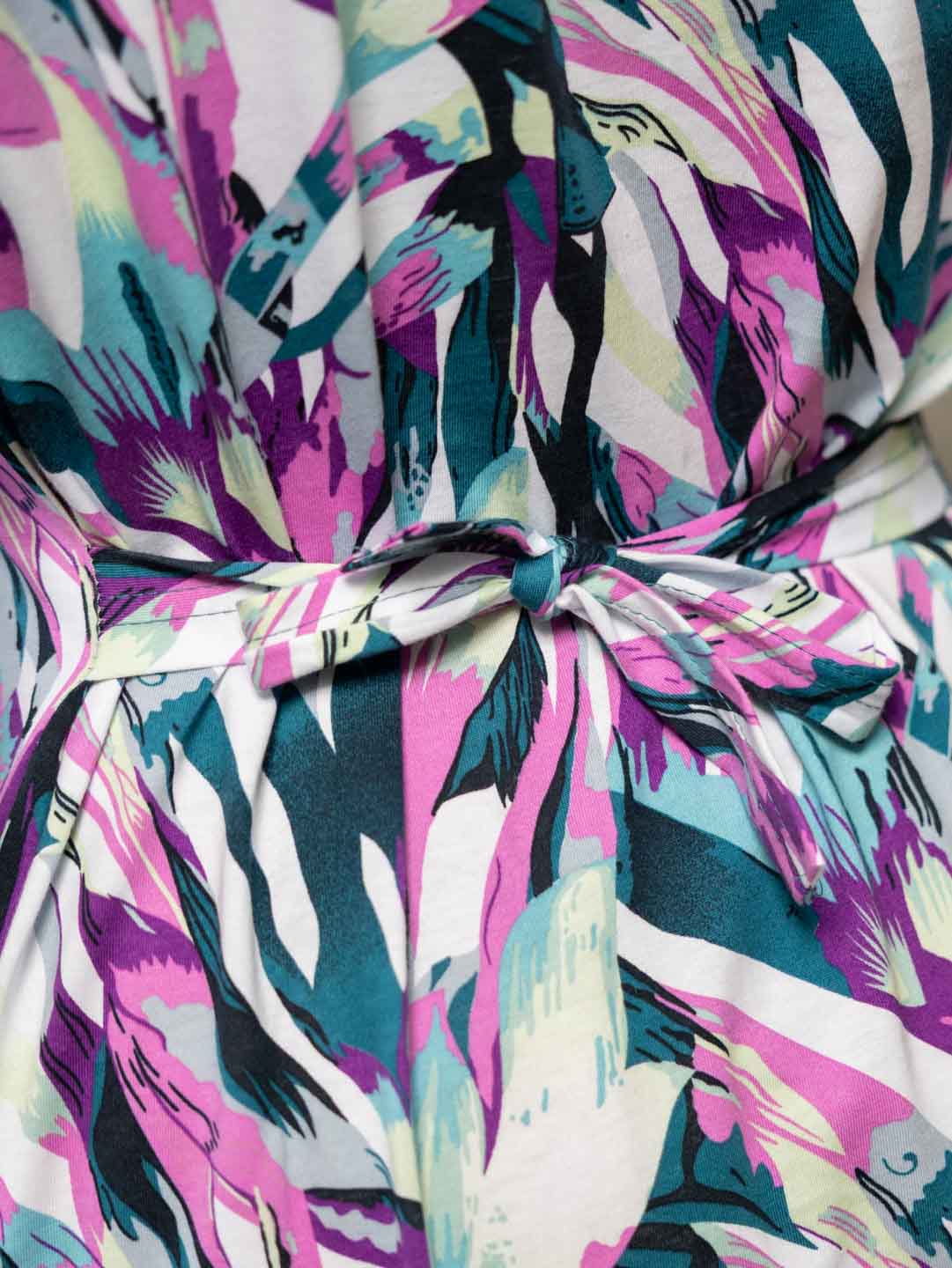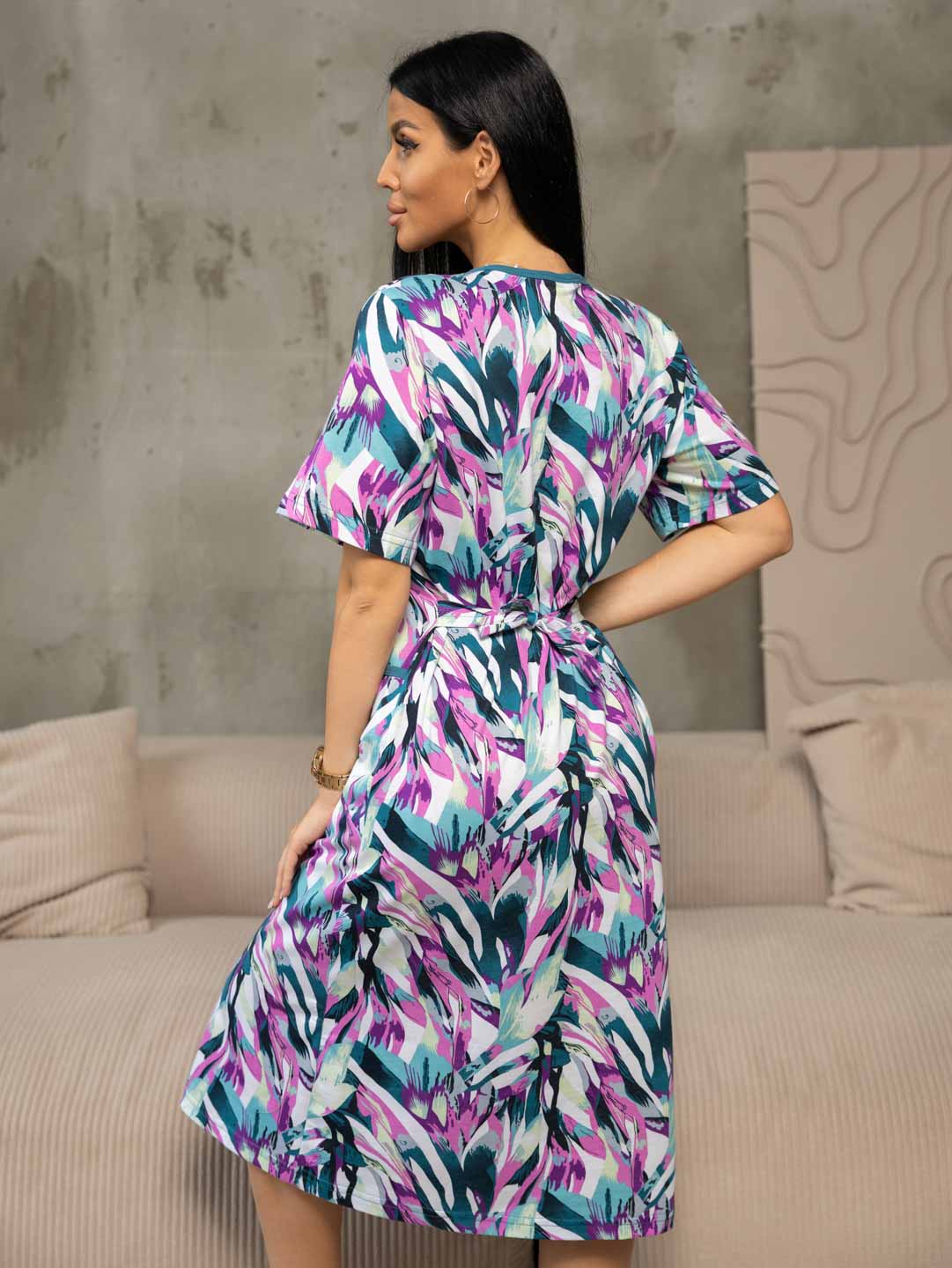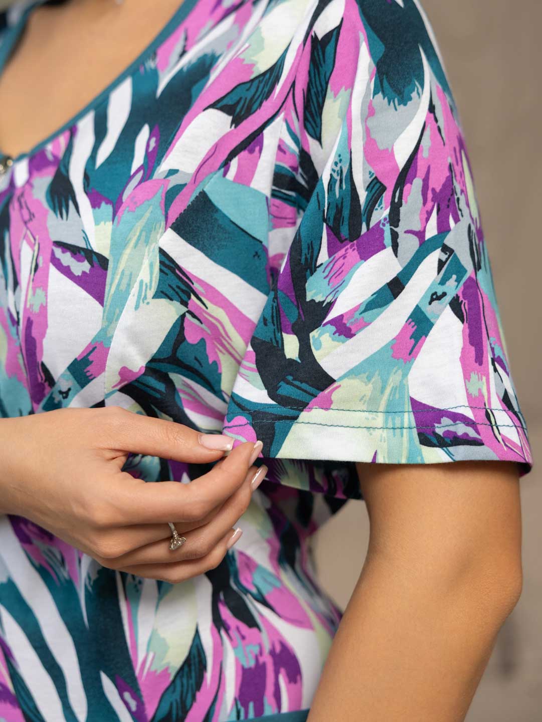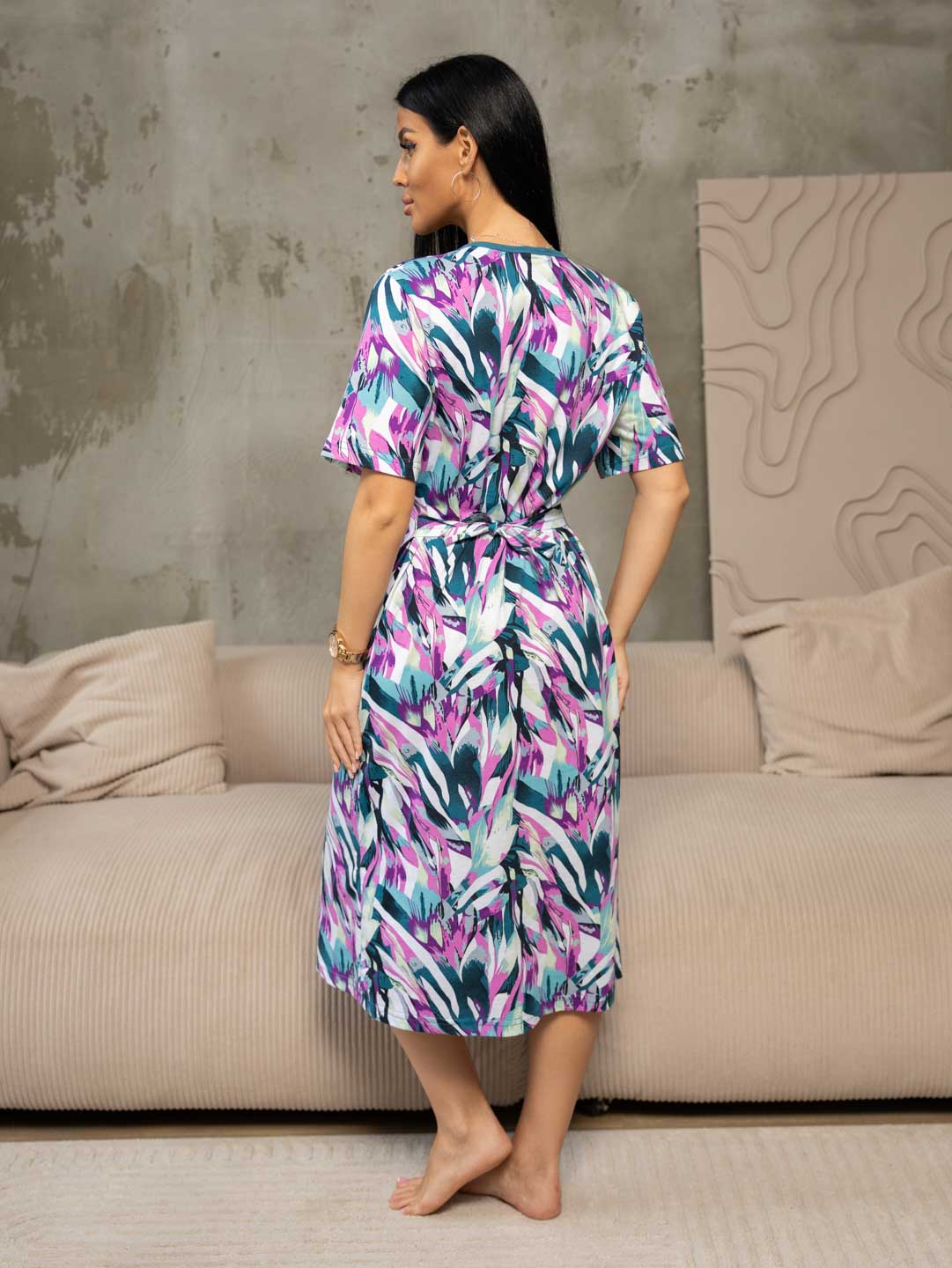 Халат женский из трикотажного полотна - кулирка, длиной ниже колена, прямого силуэта. Полочка с рельефами и карманами в них. Рукав втачной базового покроя длиной до линии локтевого сгиба.
