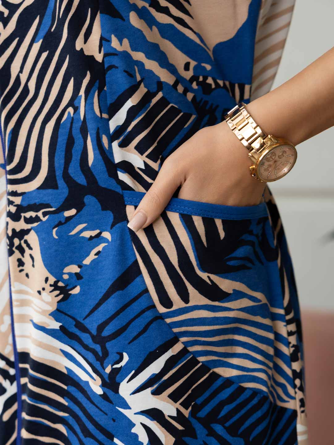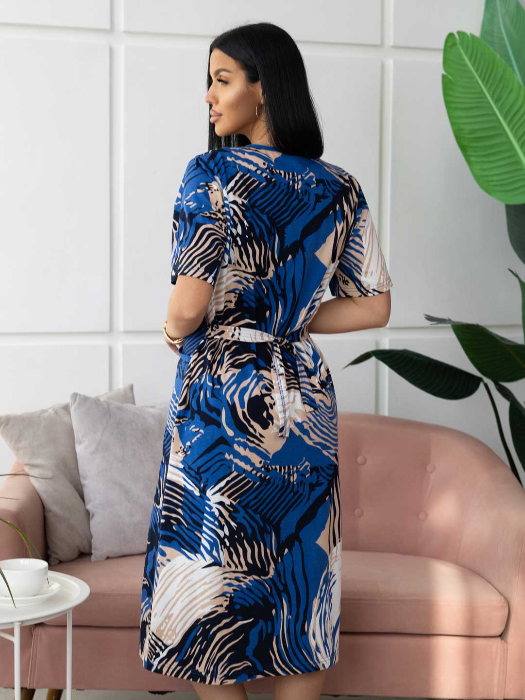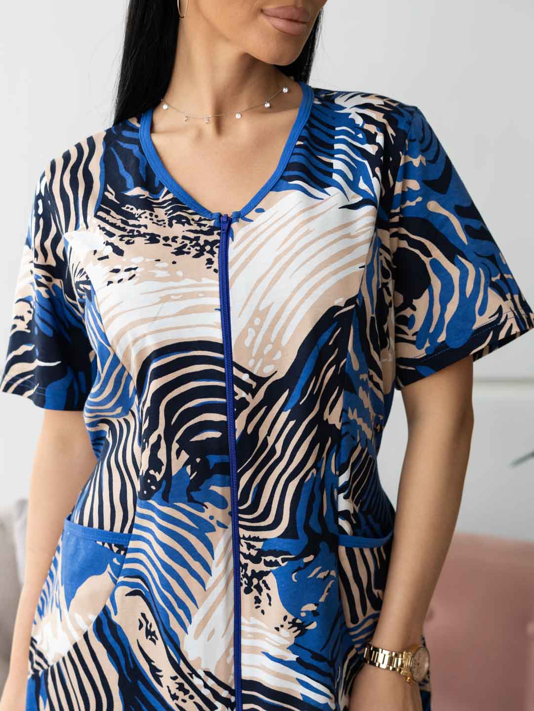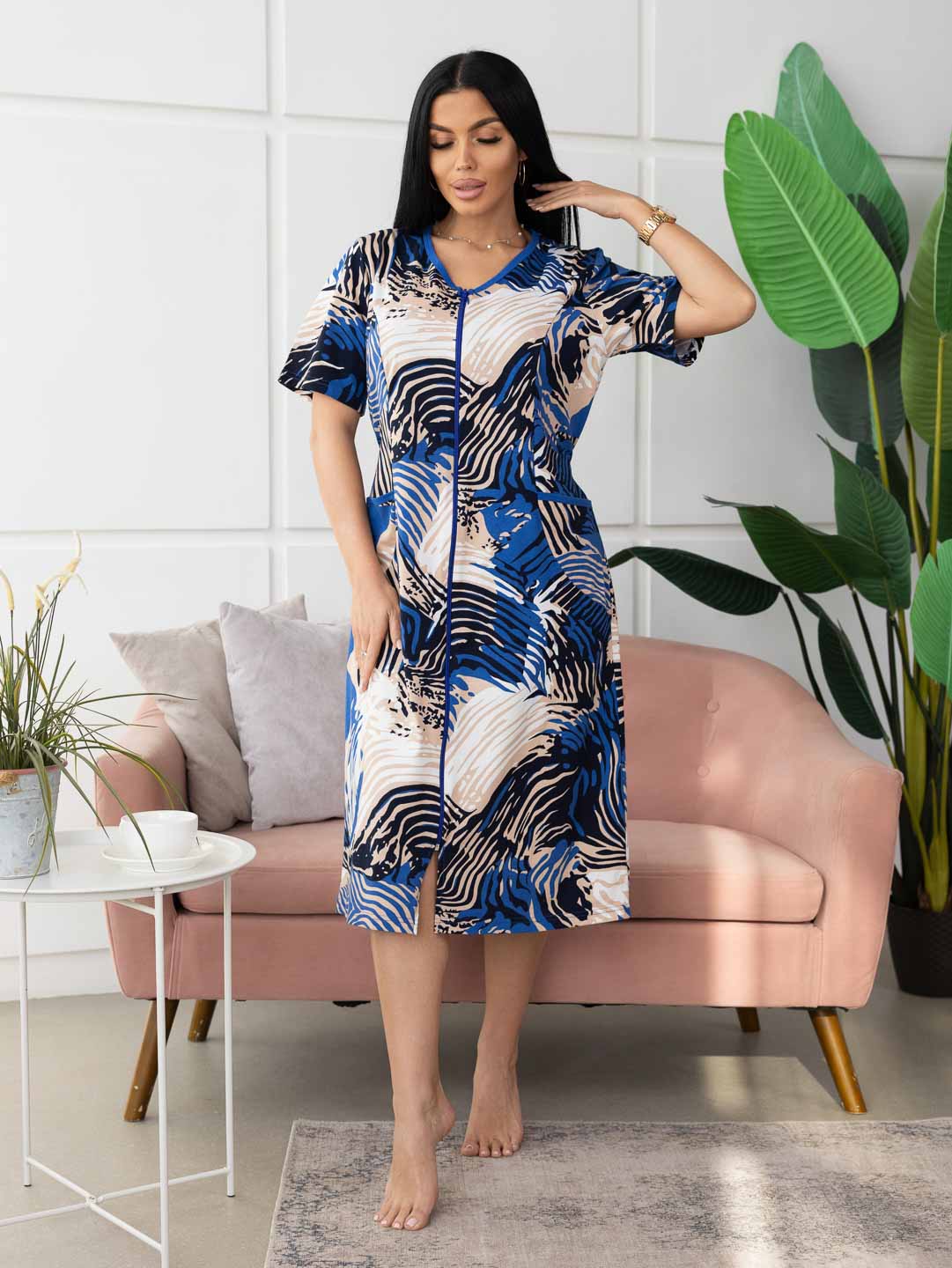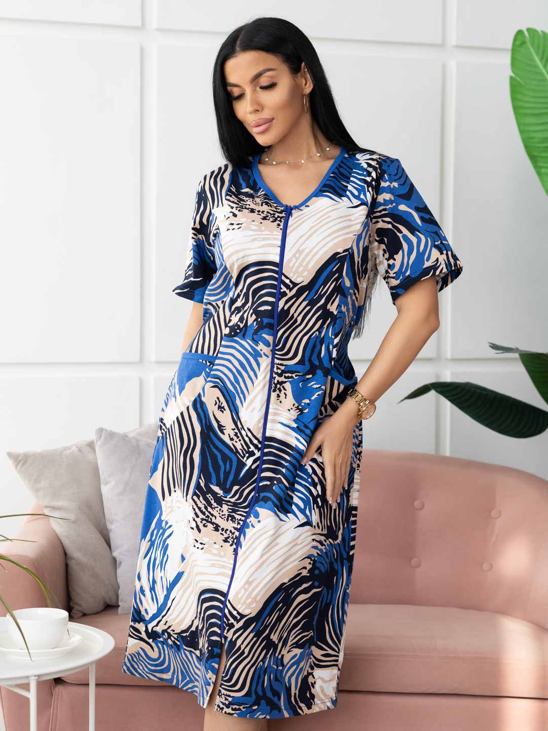 Халат женский из трикотажного полотна - кулирка, длиной ниже колена, прямого силуэта. Полочка с рельефами и карманами в них. Рукав втачной базового покроя длиной до линии локтевого сгиба.