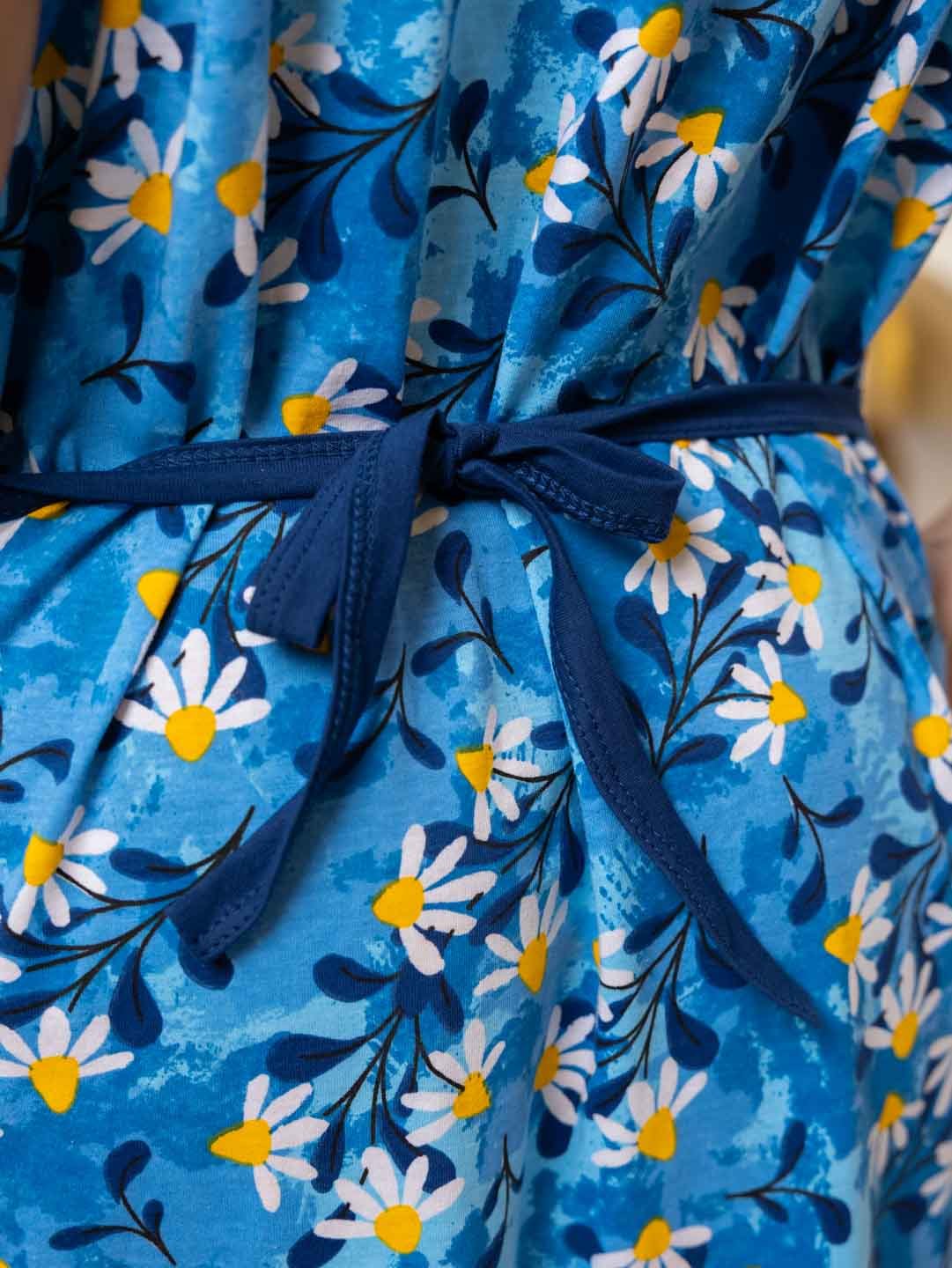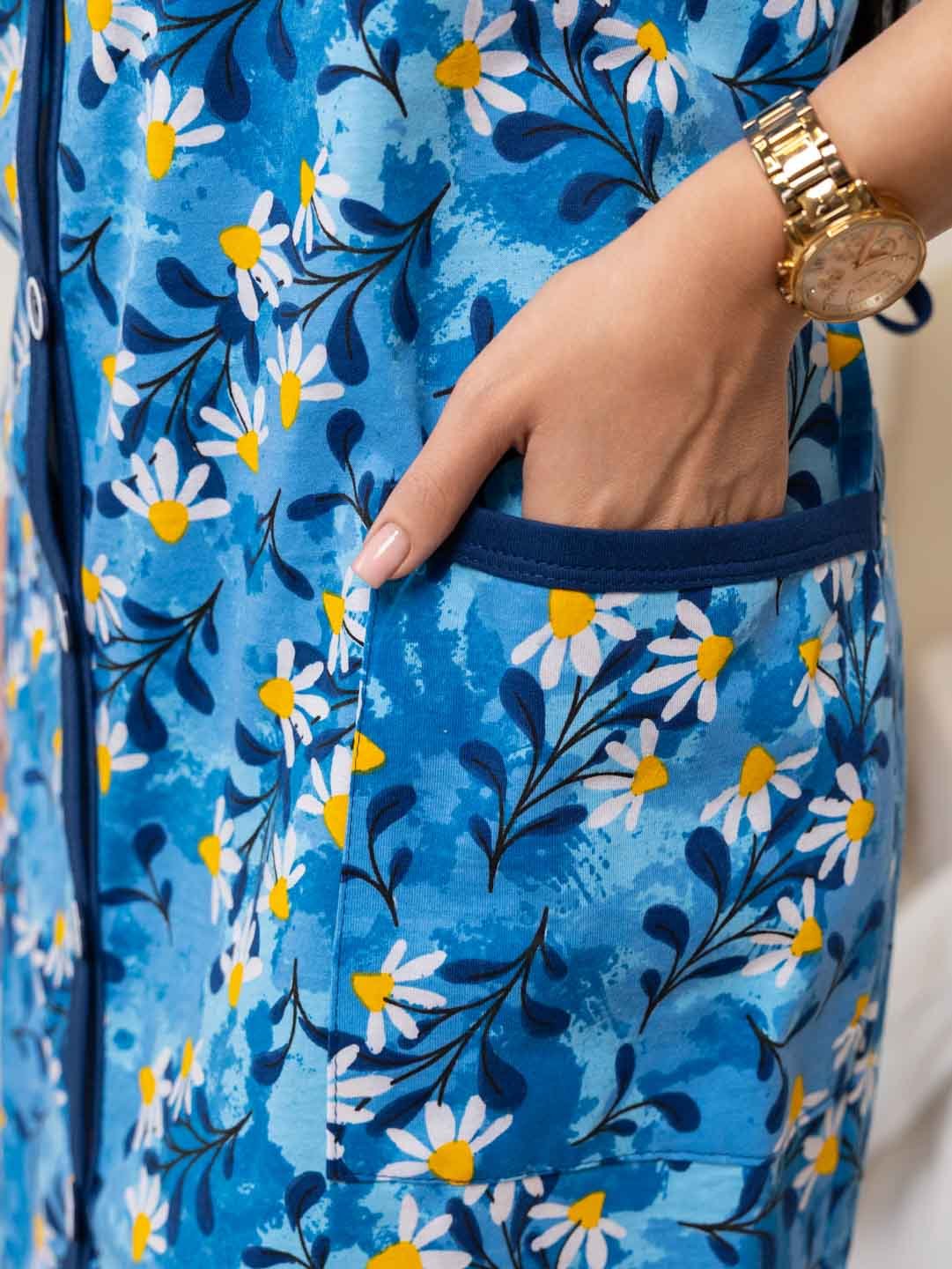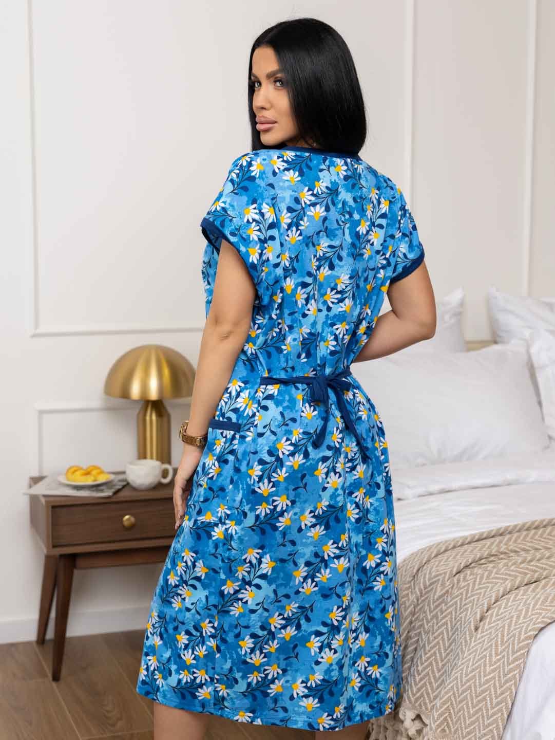 Халат женский домашний из трикотажа, длиной чуть ниже колена. Рукав - цельнокройный, короткий. Вырез горловины V-образный. На полочке застежка на пуговицы и накладные карманы.