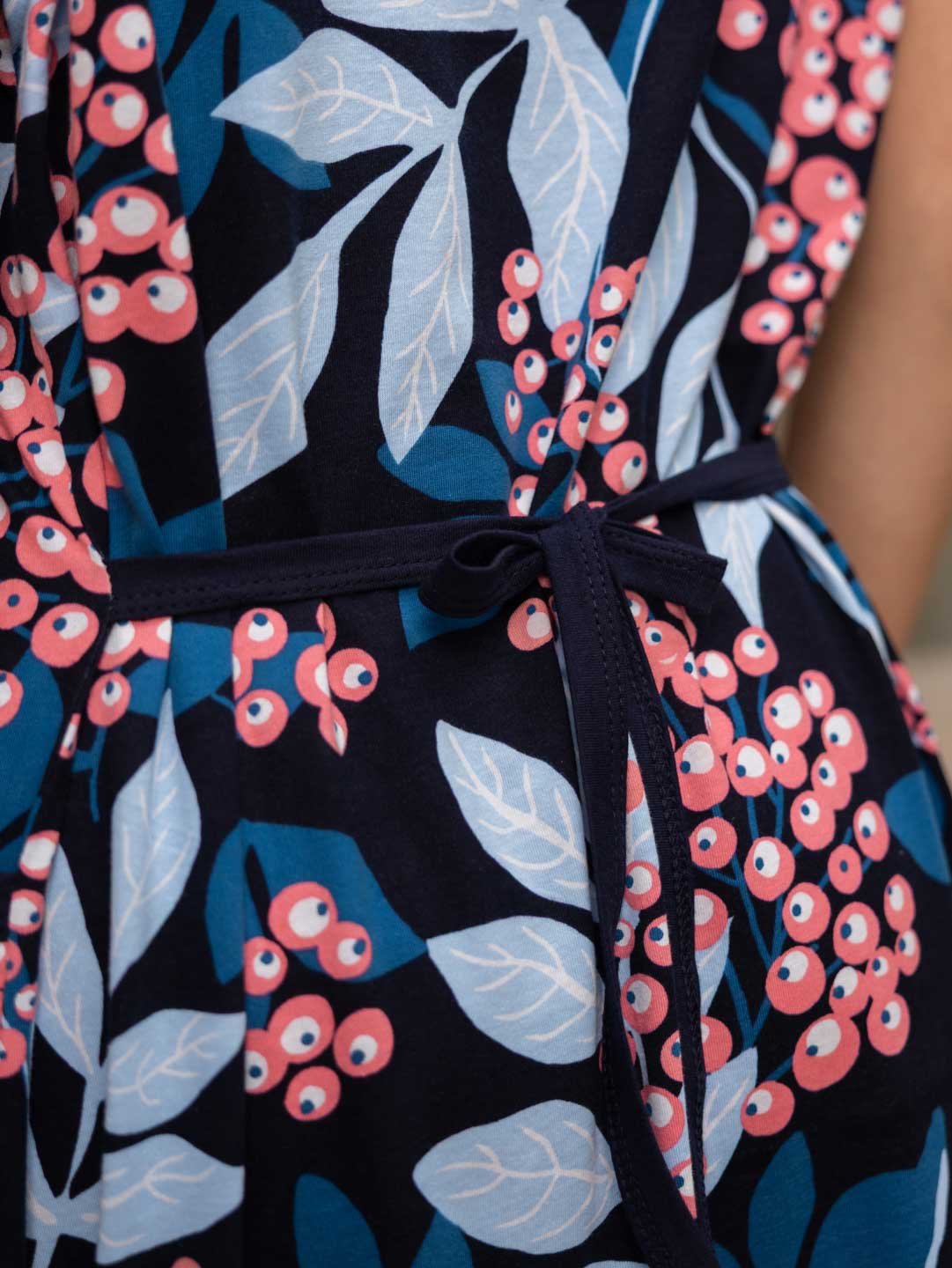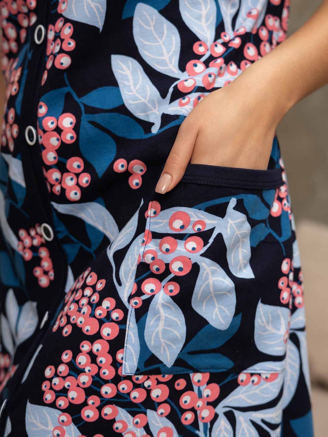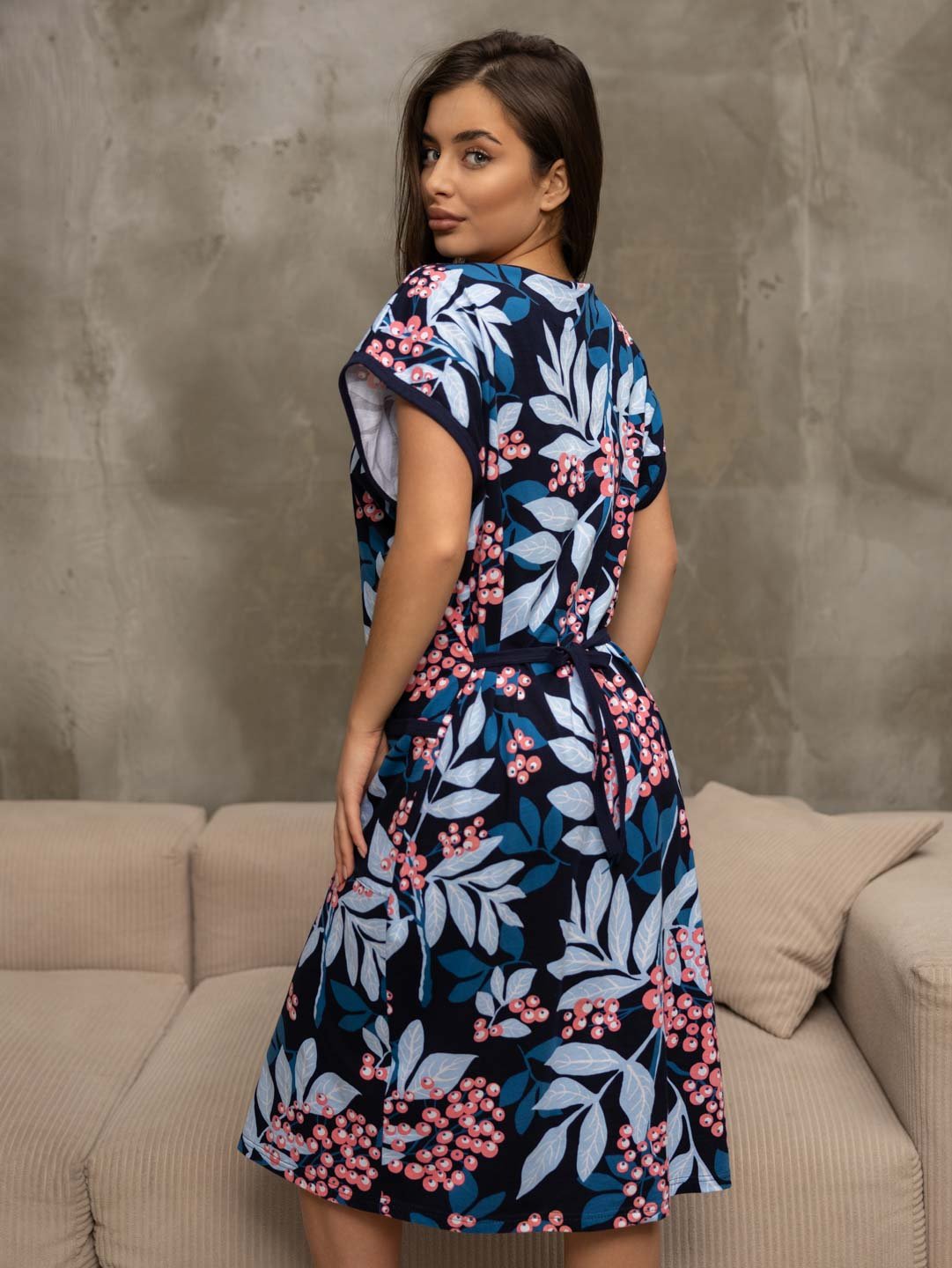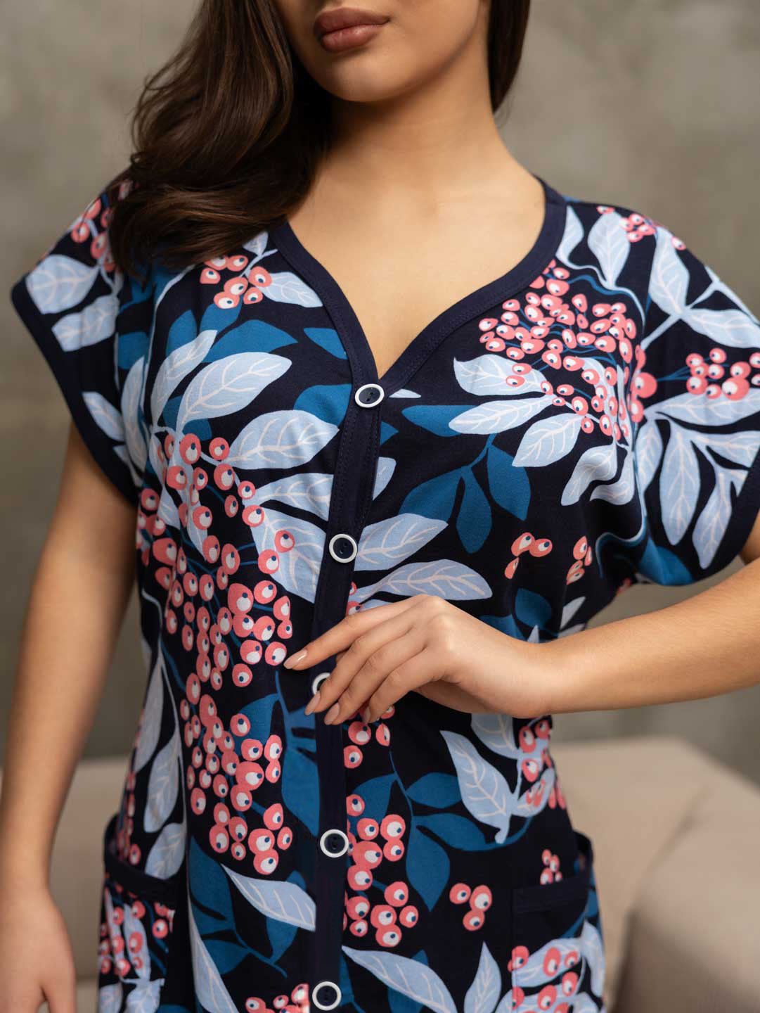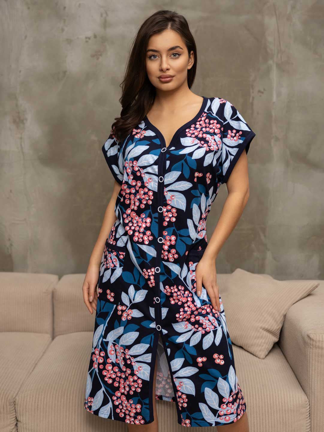 Халат женский домашний из трикотажа, длиной чуть ниже колена. Рукав - цельнокройный, короткий. Вырез горловины V-образный. На полочке застежка на пуговицы и накладные карманы.