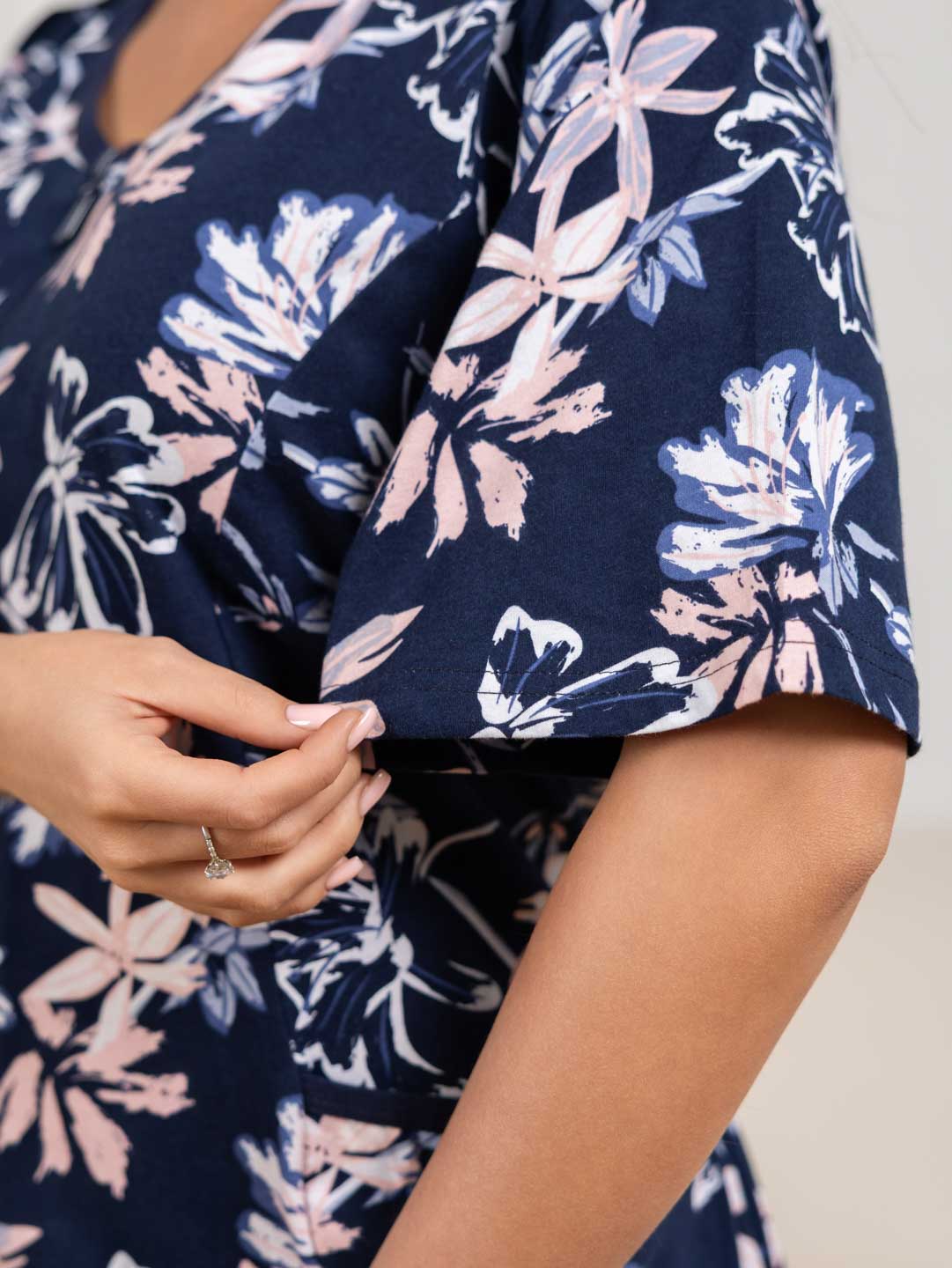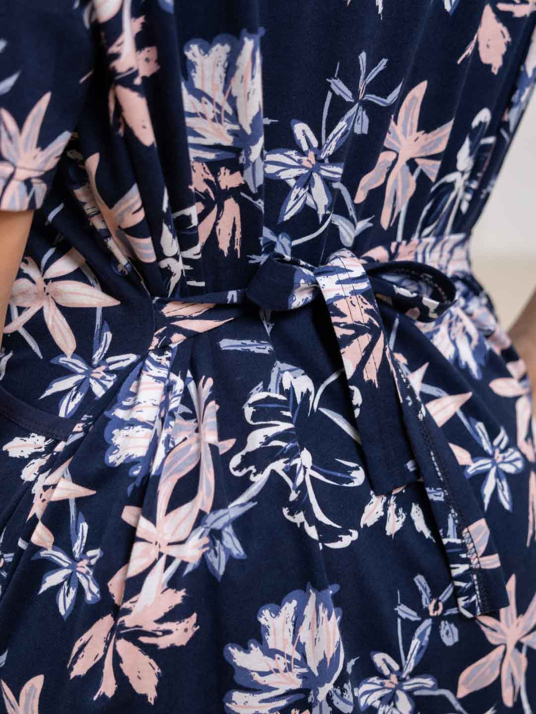 Халат женский из 100% хлопка, полуприлегающего силуэта длиной чуть ниже уровня колена. Халат на молнии, спереди накладные карманы, горловина обработана окантовкой, сзади пояс для приталивания по фигуре. Рост модели 165см.