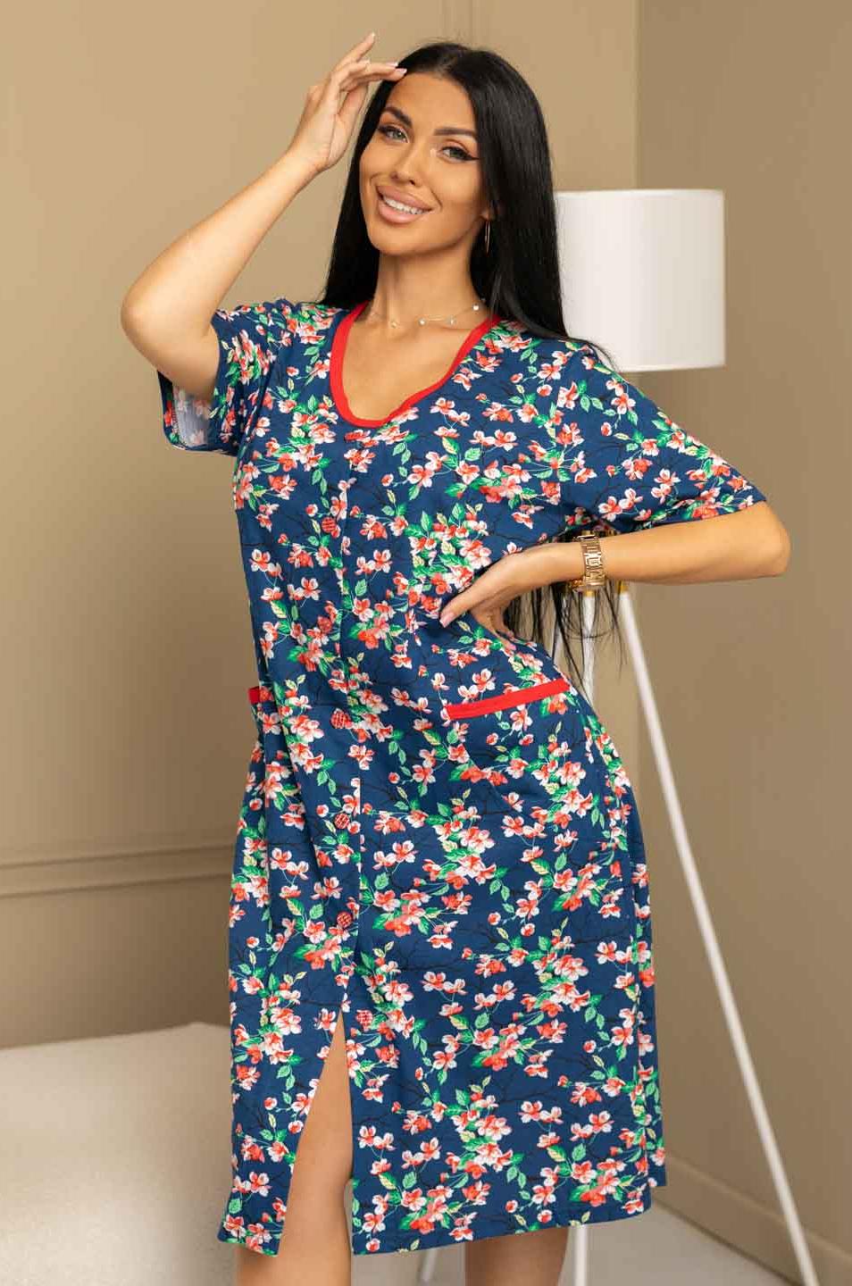 Халат женский из трикотажа, длиной до уровня колена. Рукав - втачной, длиной 1/2. Вырез горловины О-образный. Застежка на пуговицы.
