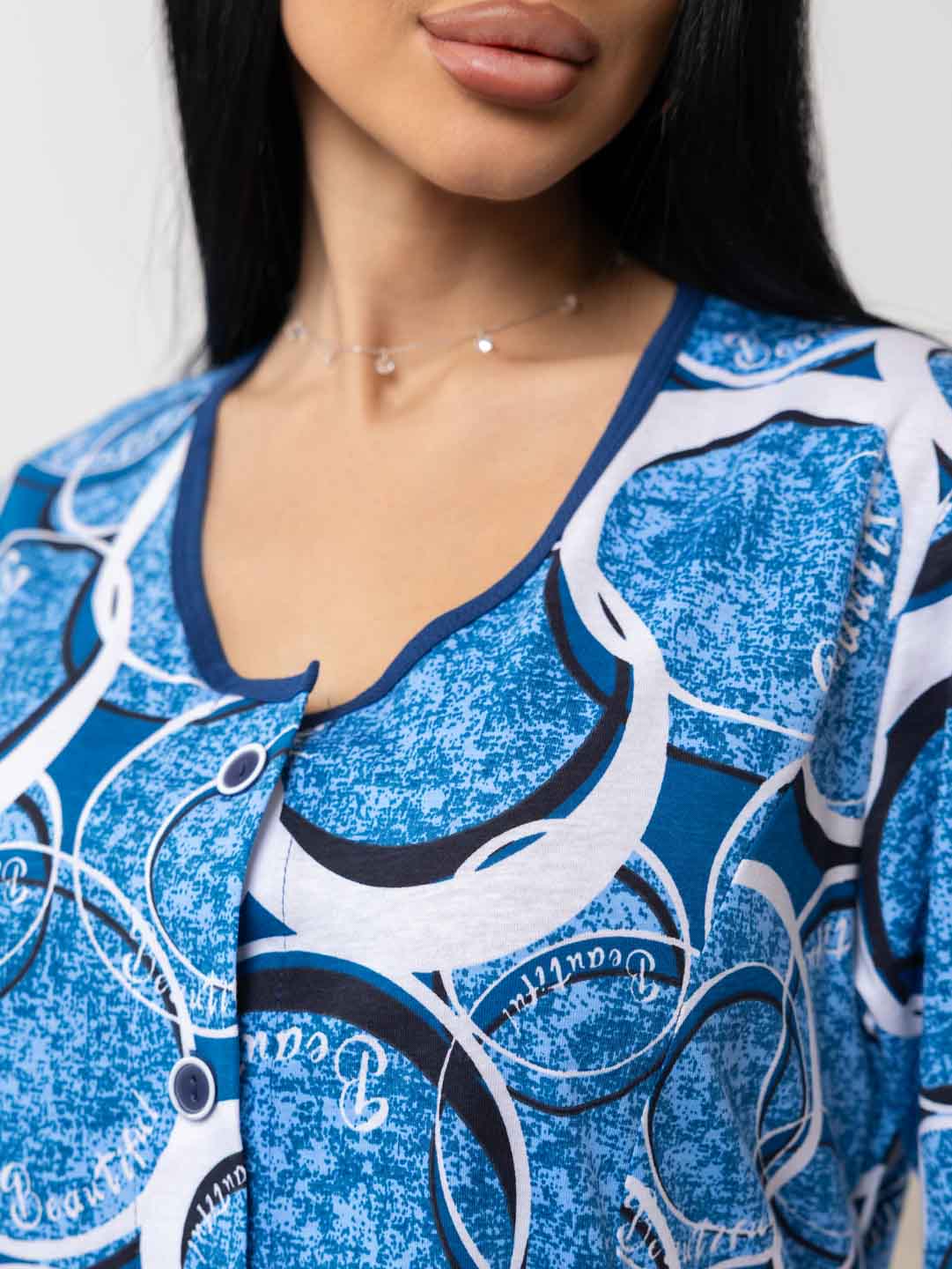 Халат женский из трикотажа, длиной до уровня колена. Рукав - втачной, длиной 1/2. Вырез горловины О-образный. Застежка на пуговицы.