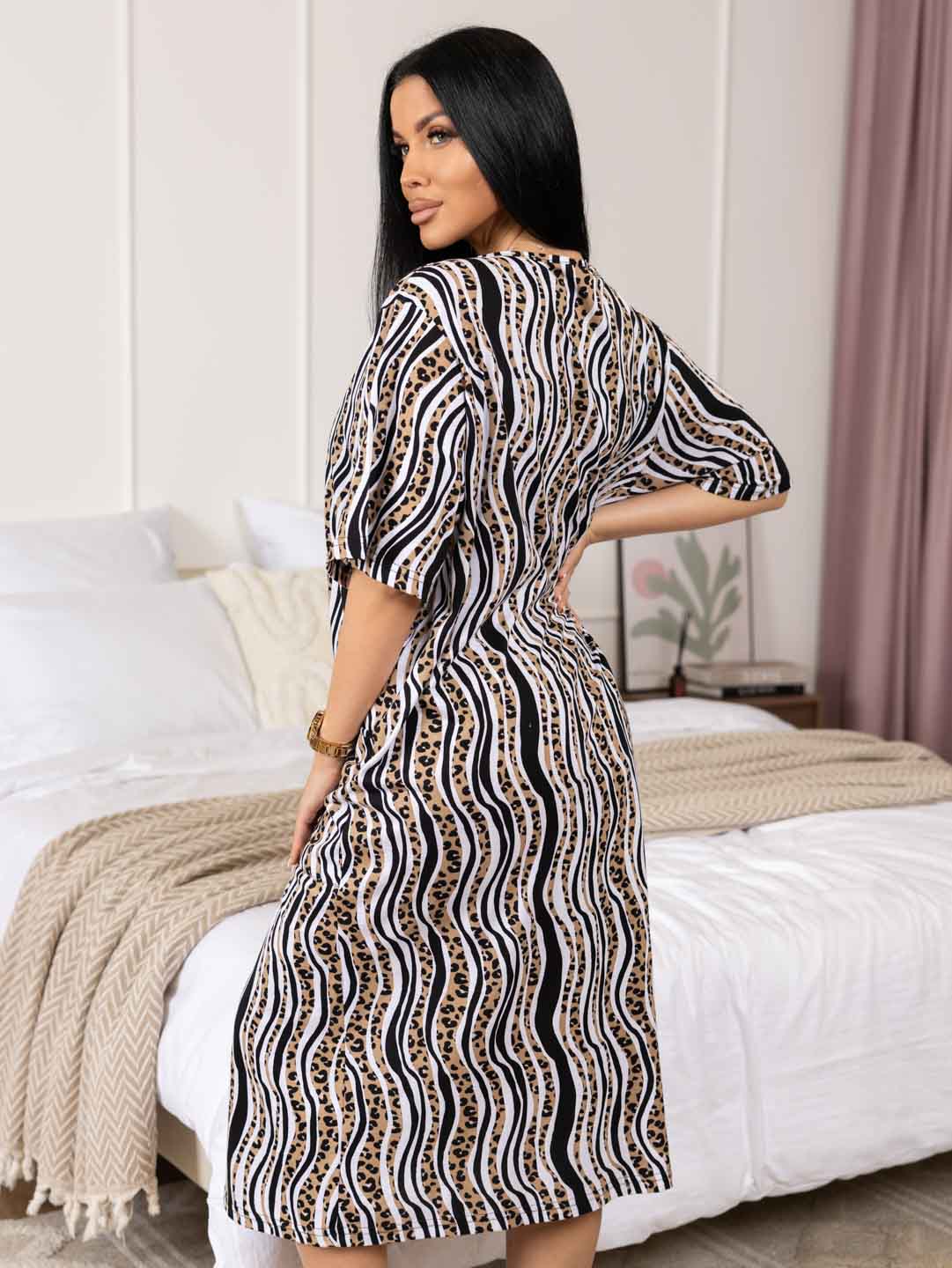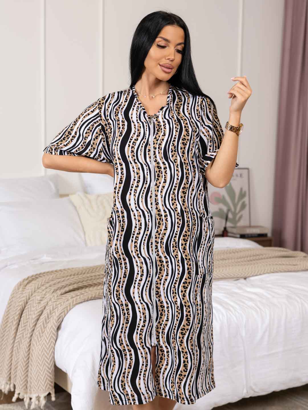 Халат прямого силуэта на молнии, с накладными карманами, коротким рукавом и О-образной горловиной.