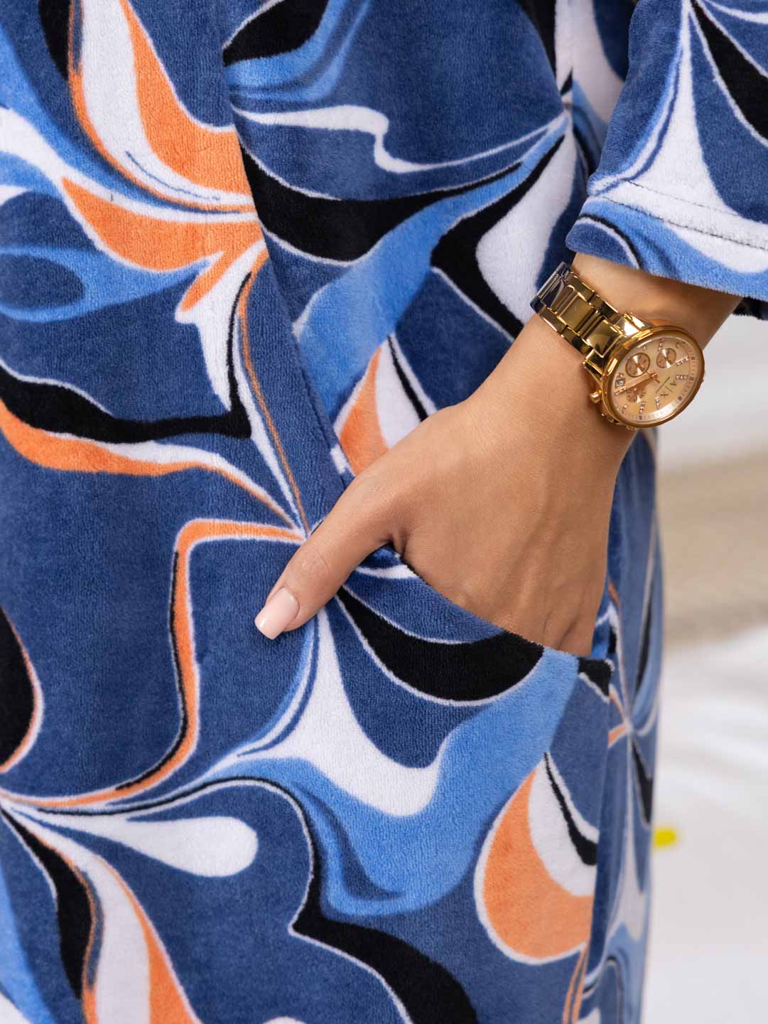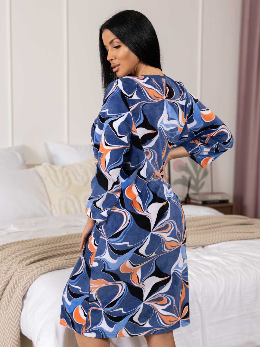 Халат на молни из велюра длиной чуть ниже колена, с базовым втачным рукавом, О-образной горловиной, кокеткой спереди и складками по груди. Рост модели 165см.