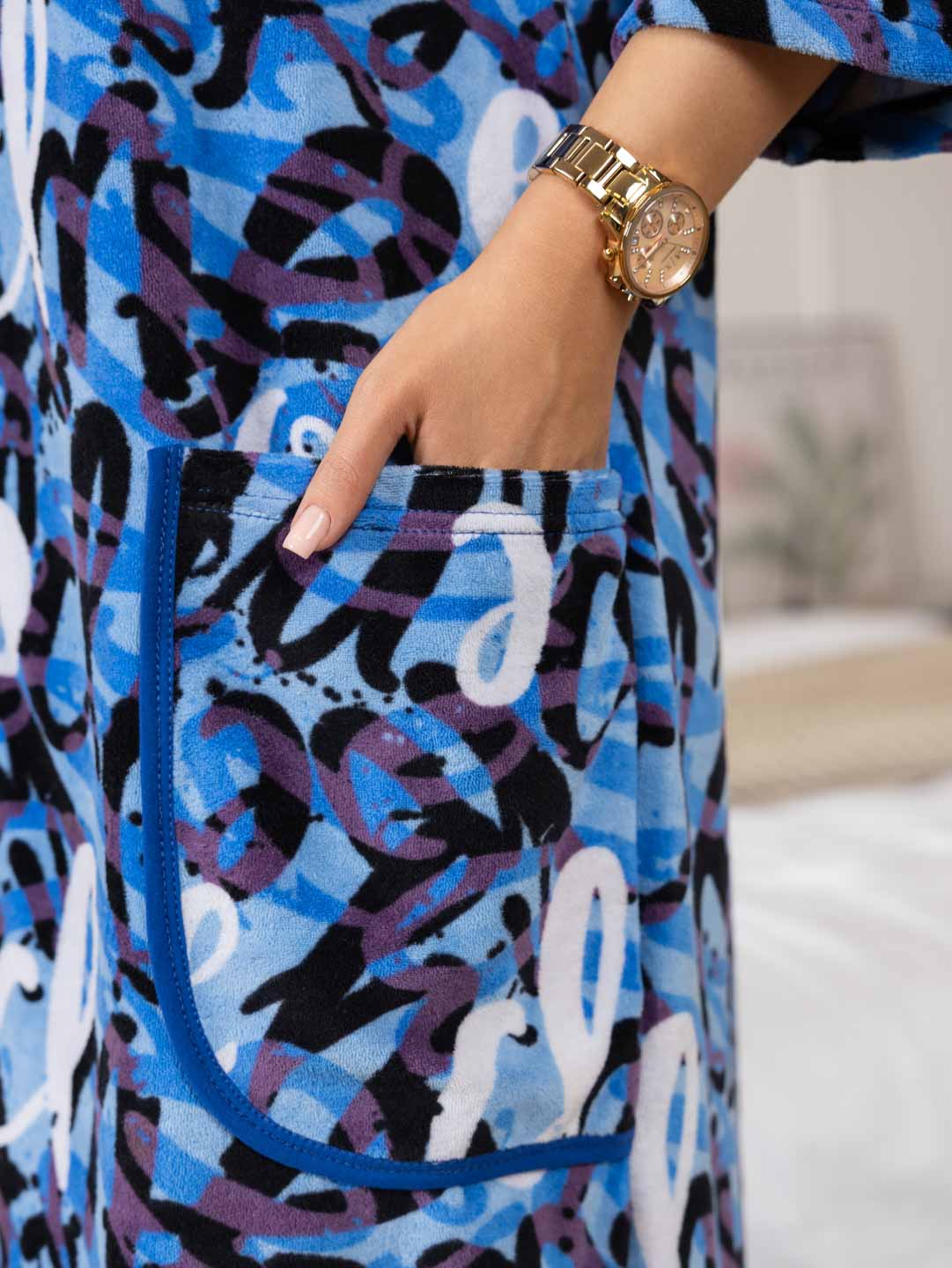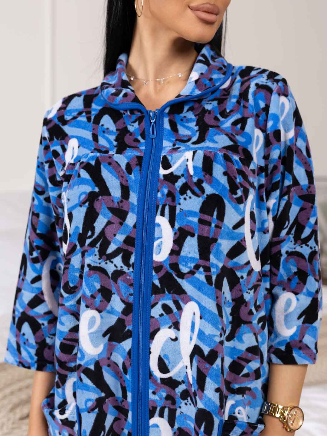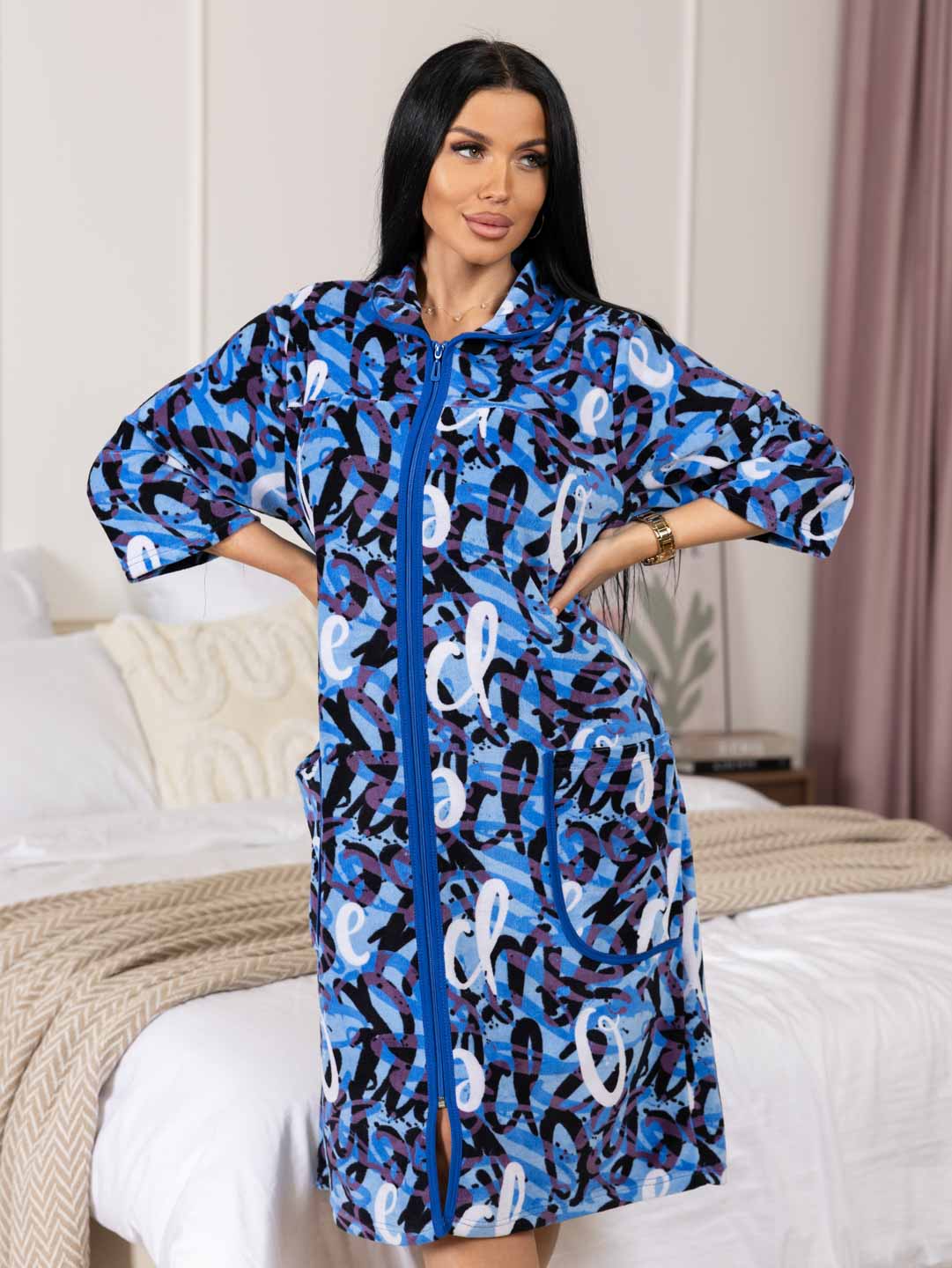 Халат женский трикотажный, длиной ниже колена. Данная модель имеет отложный воротник и застежку на молнию. Рукав - втачной, длиной 3/4. Большие удобные накладные карманы.