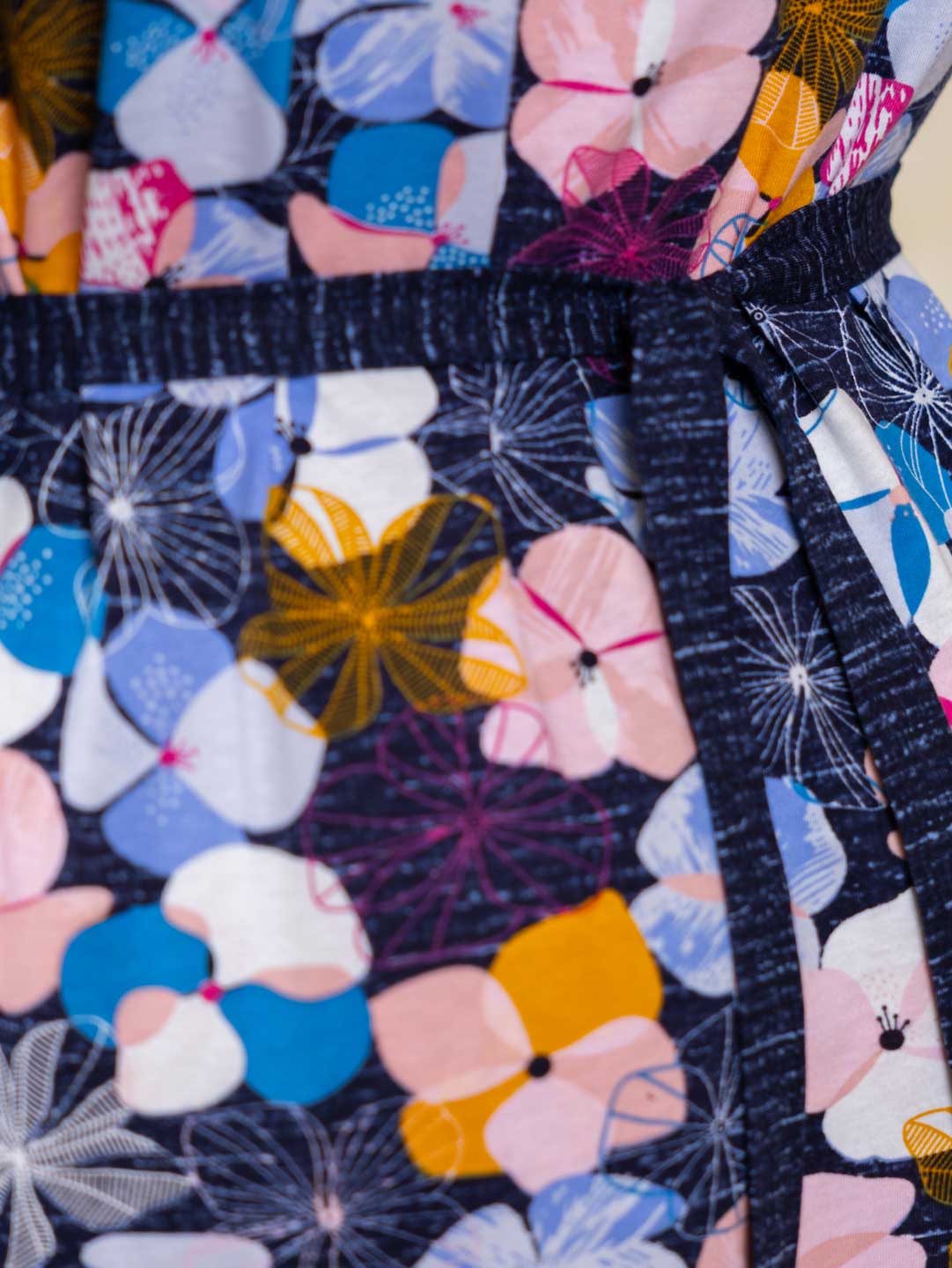Халат домашний на молнии, с цельнокроенным рукавом и округлой горловиной. В боковых швах удобные карманы. В нижней части - вырезы, для большей свободы движения. На спинке имеются завязки, для регулировки ширины изделия по талии.