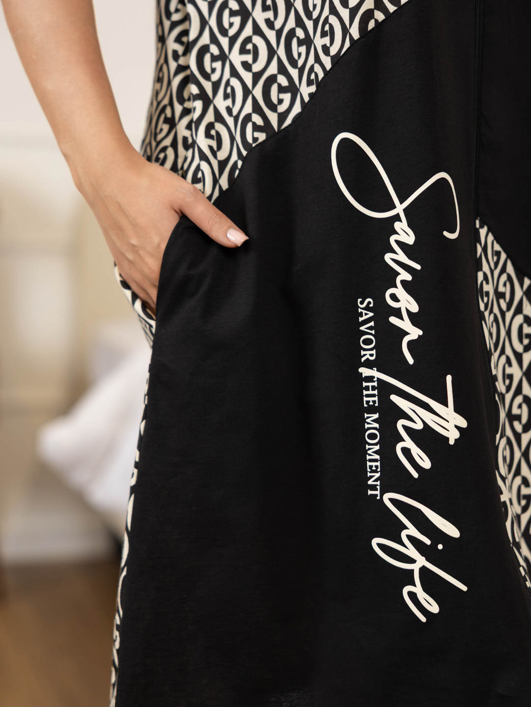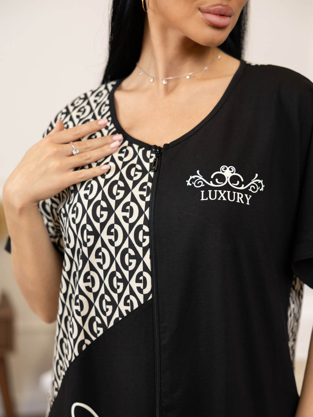 Женский комбинированный халат с принтом на молнии. Залат прямого силуэта с о-образной горлдовиной и карманами в боковых швах.