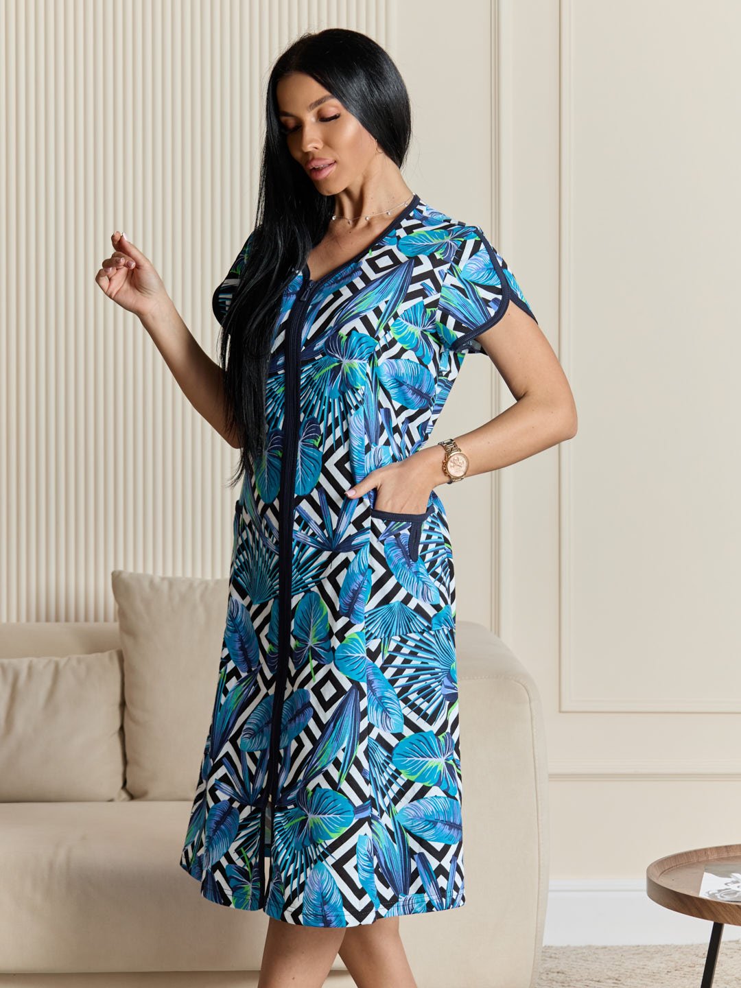 Женский домашний халат из хлопка, полуприлегающего силуэта с застежкой на молнию. Спереди на халате рельефные швы и два накладных кармана. Сзади пояс, обеспечивающий прилегание по спинке и создающий силуэт песочные часы.